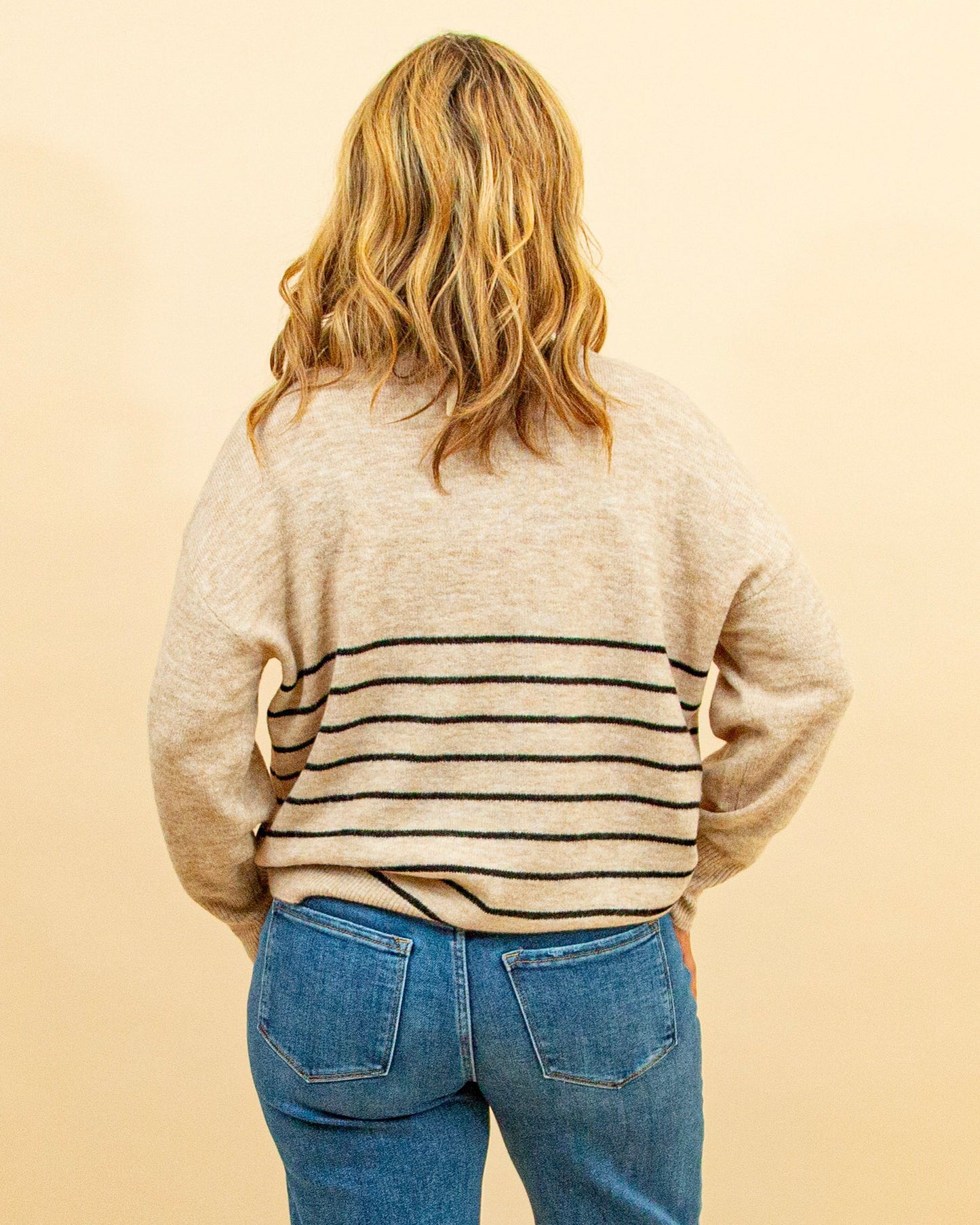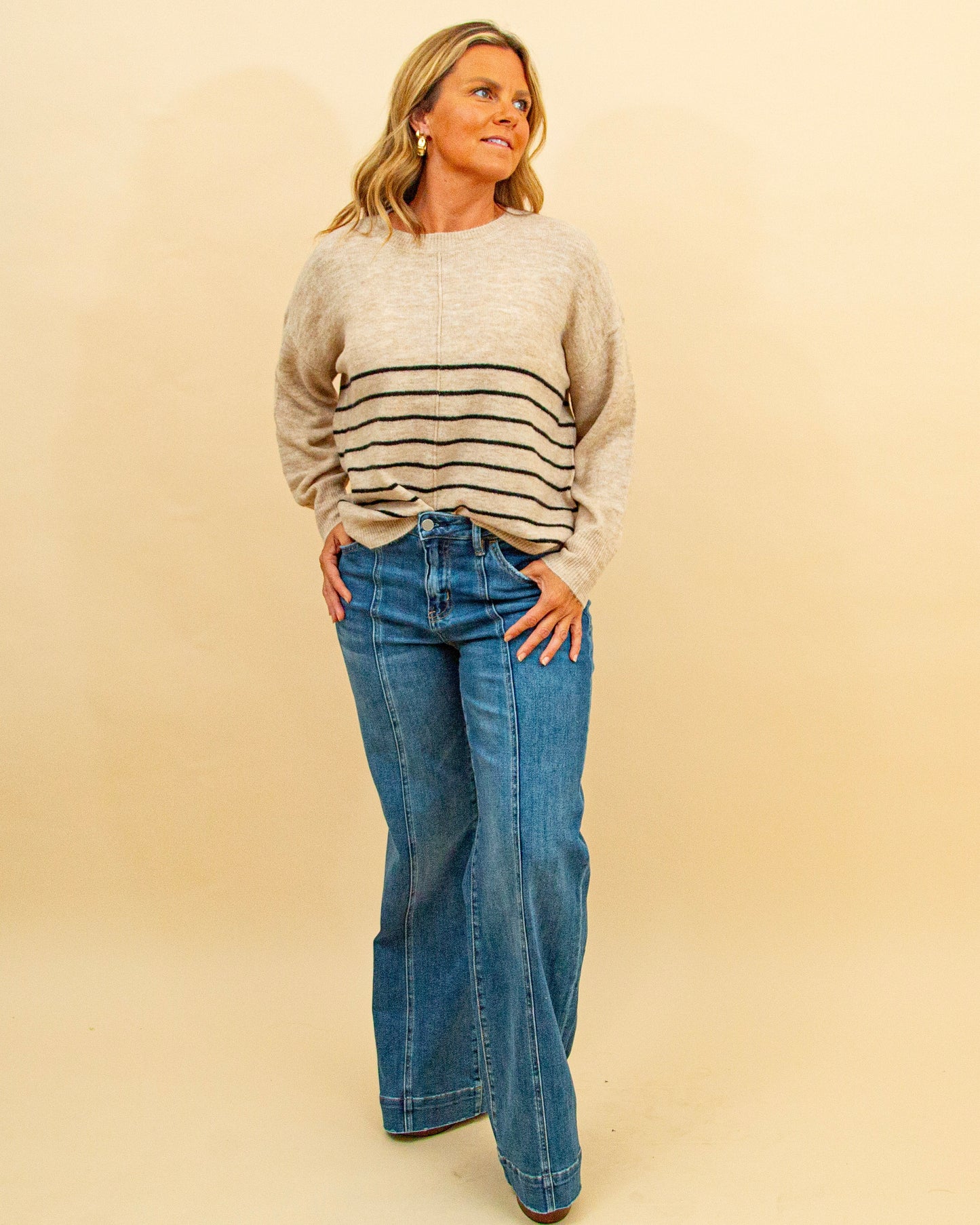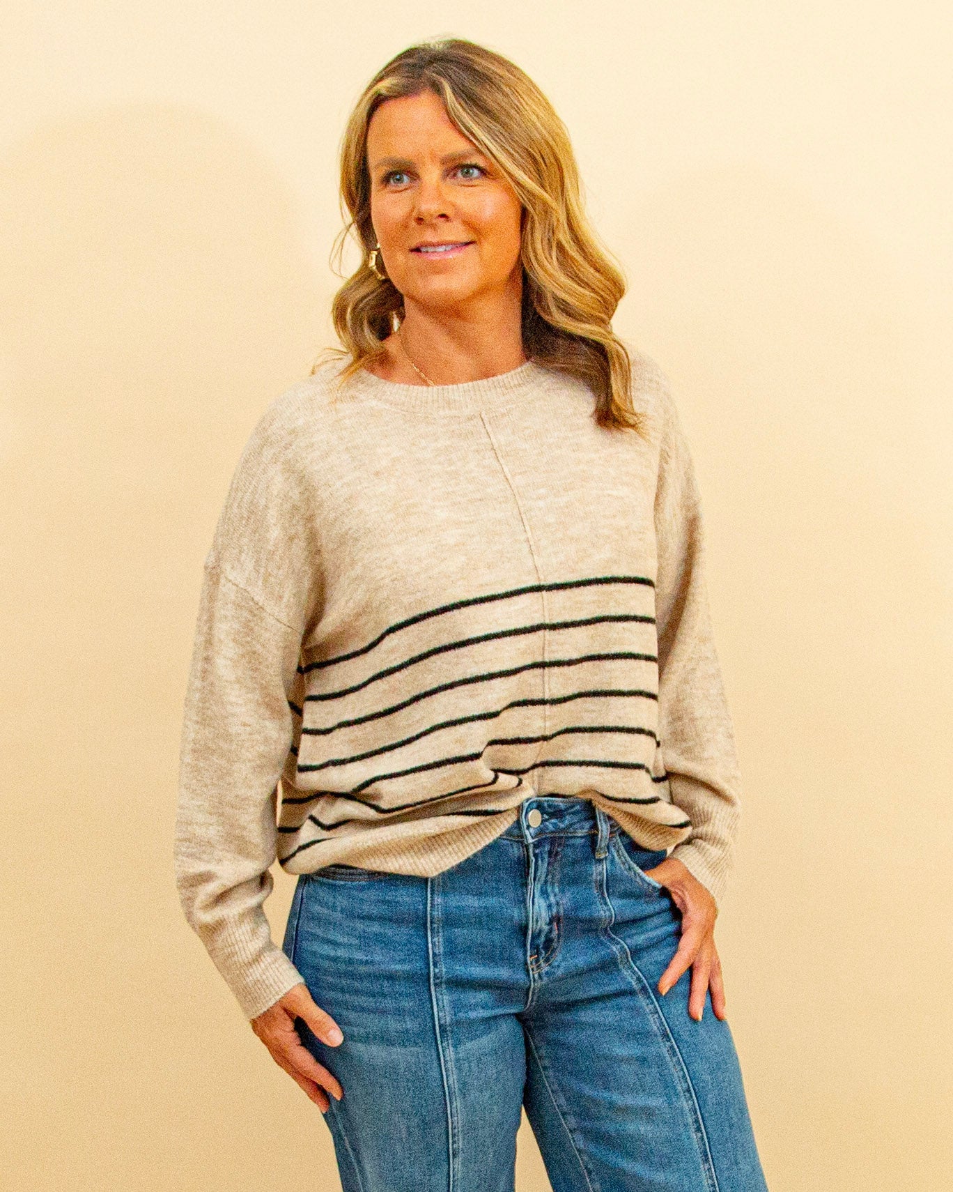 The Straight To It Sweater in Taupe keeps things simple with a modern twist. Featuring a classic round neckline and front seam detail, this pullover pairs timeless black stripes with a warm taupe knit for a cozy, lived-in feel. Its relaxed fit makes it ideal for layering or styling with your favorite denim, joggers, or skirts for an effortlessly pulled-together fall look.