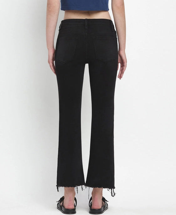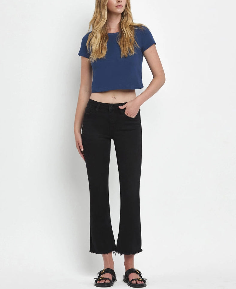 The Grandeur Mid Rise Crop Flare Jeans bring just the right mix of edge and polish. Crafted from comfort-stretch denim with a flattering mid-rise fit, this pair features a cropped flare silhouette finished with a raw, distressed hem for a lived-in look that still feels elevated. The very dark, almost-black wash makes them easy to dress up or down, whether you’re styling them with cozy knits, sleek layers, or a simple tee. Effortless, flattering, and endlessly wearable—these are the kind of jeans you’ll reach for on repeat.