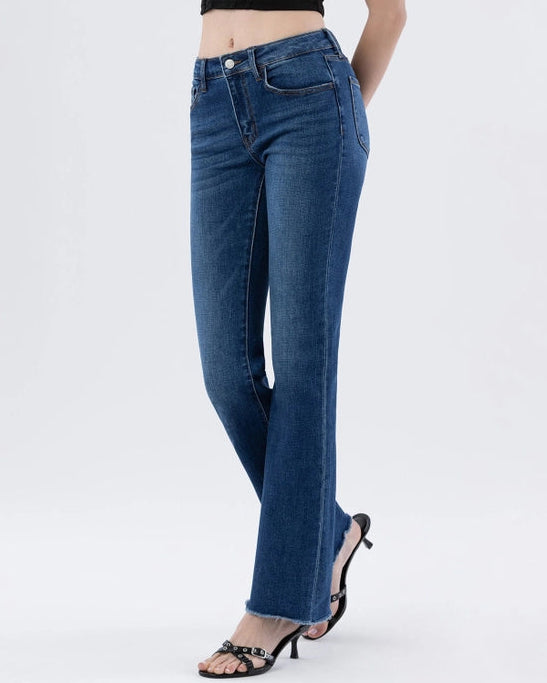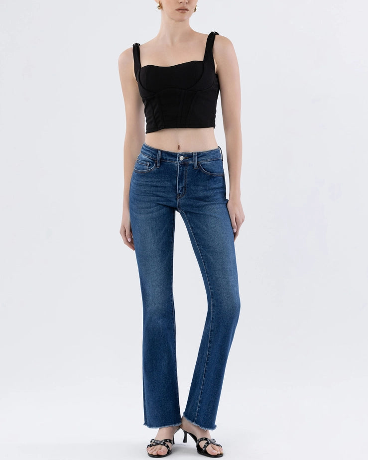 Mid rise raw hem dark wash bootcut jeans Comfort stretch denim, mid rise waist, 5 pockets, raw hem, full length, dark wash, bootcut jeans