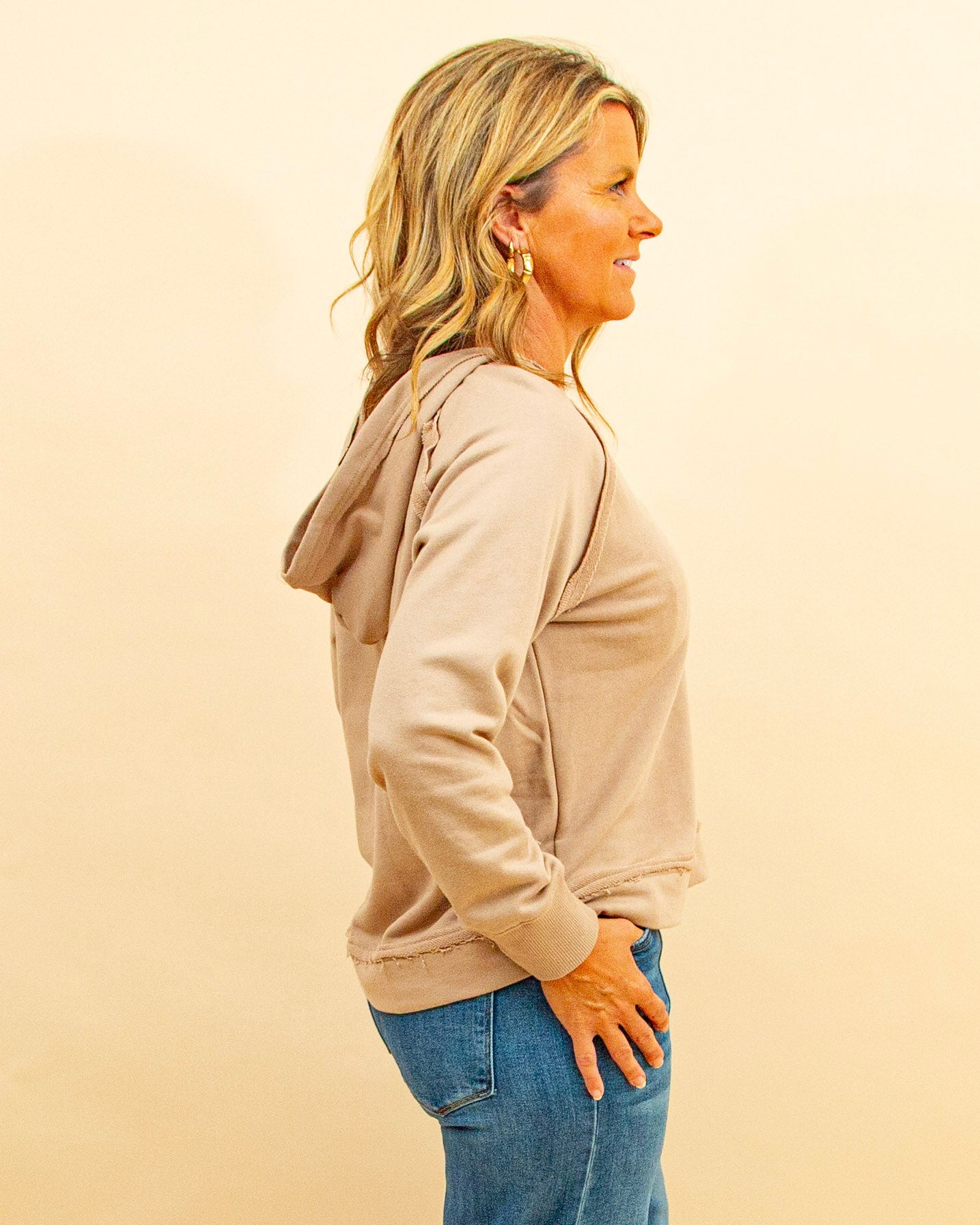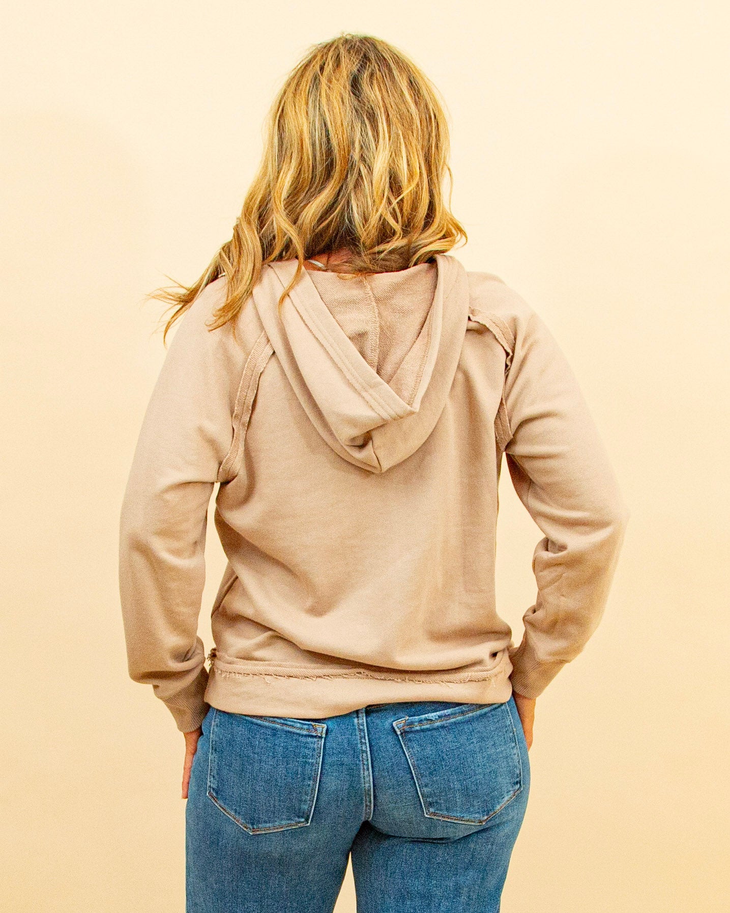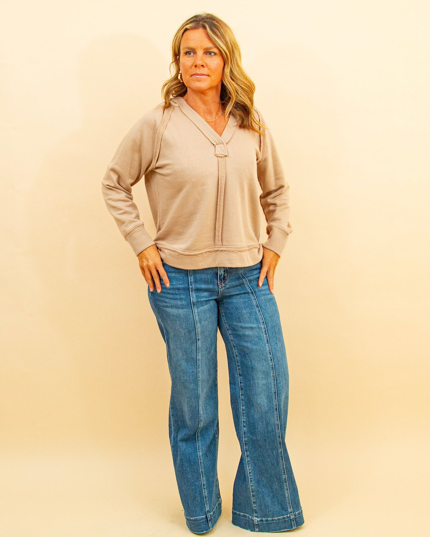 The Cozy Corner Hoodie in Taupe is your go-to lightweight layer for relaxed days. Crafted from a soft, thin knit, this hooded top features a V-neckline, raglan long sleeves, and subtle raw-edge detailing for a casual, lived-in vibe. Perfect on its own or layered under jackets and cardigans, it adds effortless comfort without bulk. Pair it with joggers for lounging or denim for a laid-back weekend look. Make your cozy corner complete—shop it now in store and online.