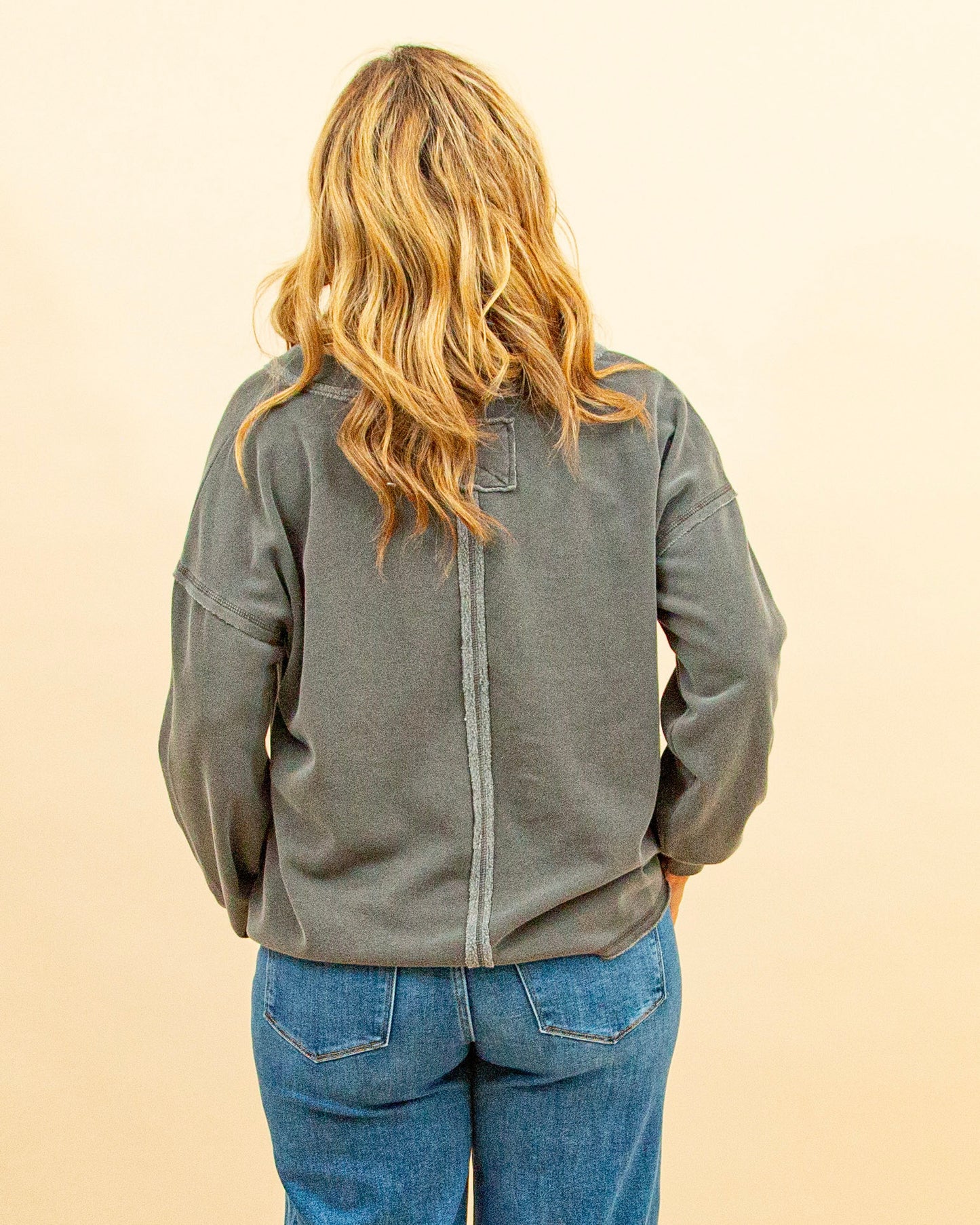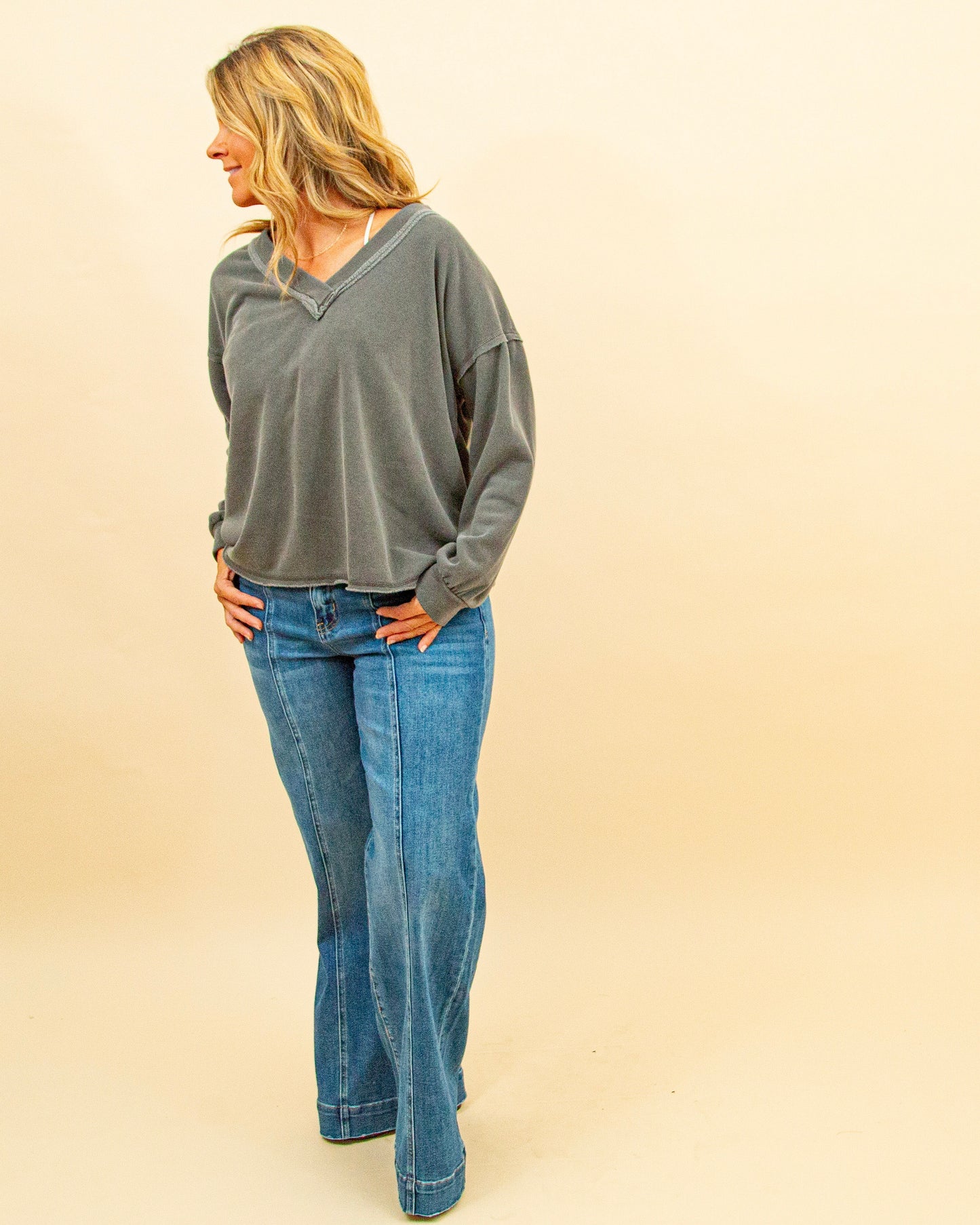 The Cross the Line Top in Charcoal is where laid-back meets a little bit bold. Designed with a relaxed fit and drop shoulders, this V-neck knit top features raw edges and reverse stitching for that perfectly undone look. Its soft, lived-in feel makes it easy to wear on repeat, while the subtle details give it a modern, effortless edge. A go-to piece for casual days that still call for style.