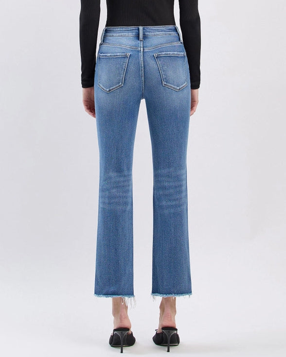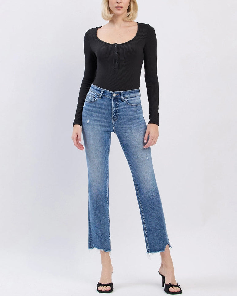 High rise uneven raw hem slim straight jeans Comfort stretch denim, high rise waist, distressed detail, uneven raw hem, cropped length, slim straight jeans