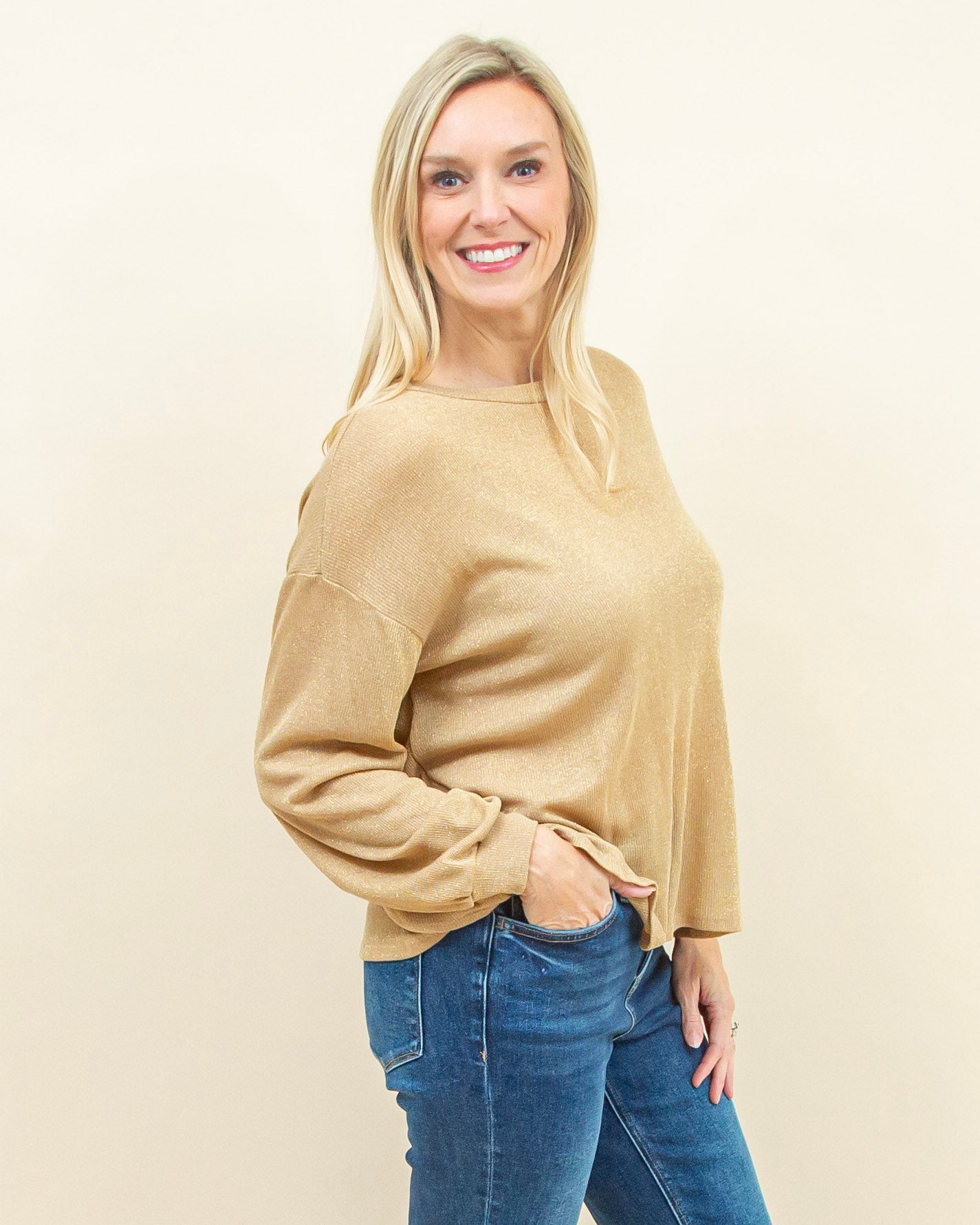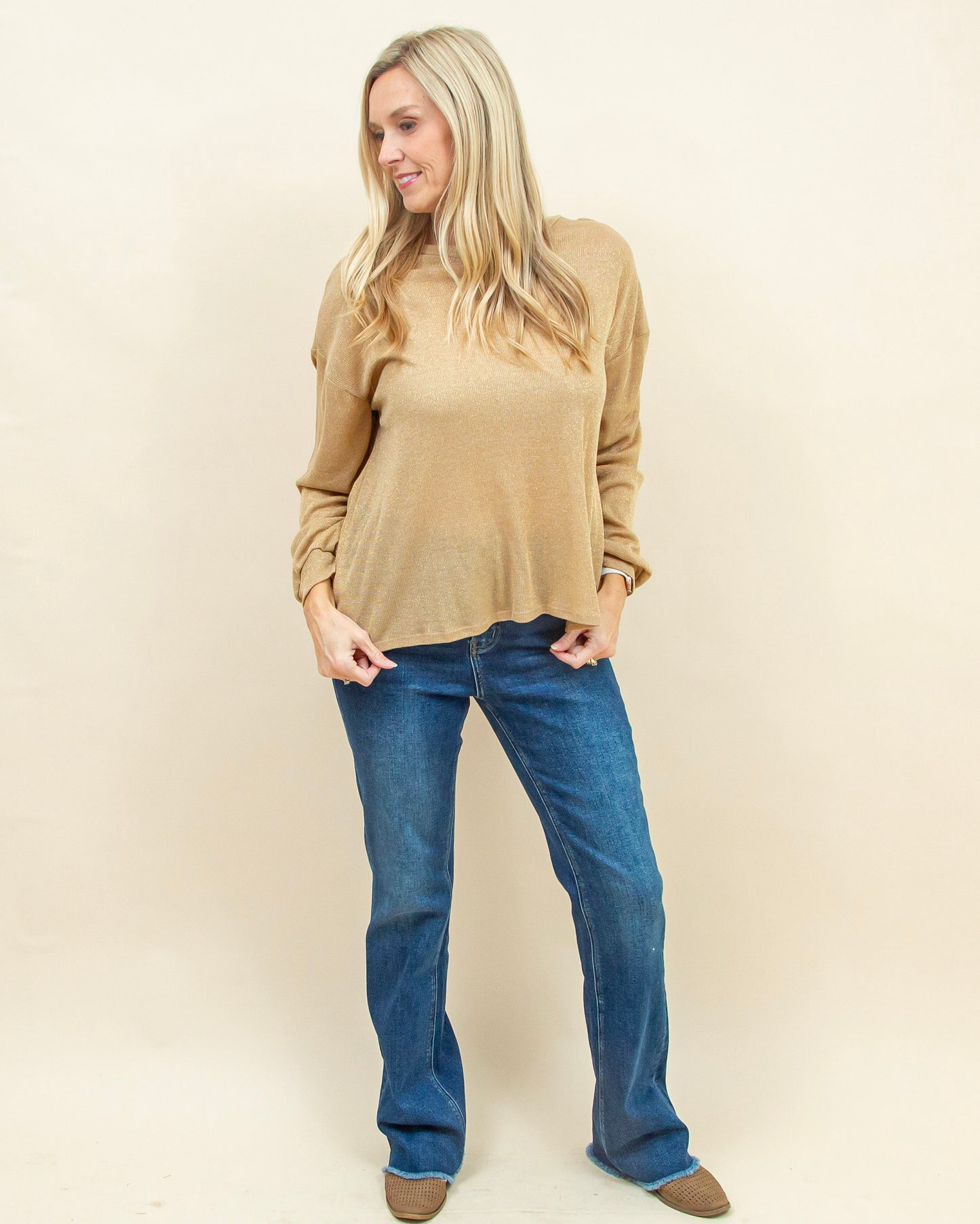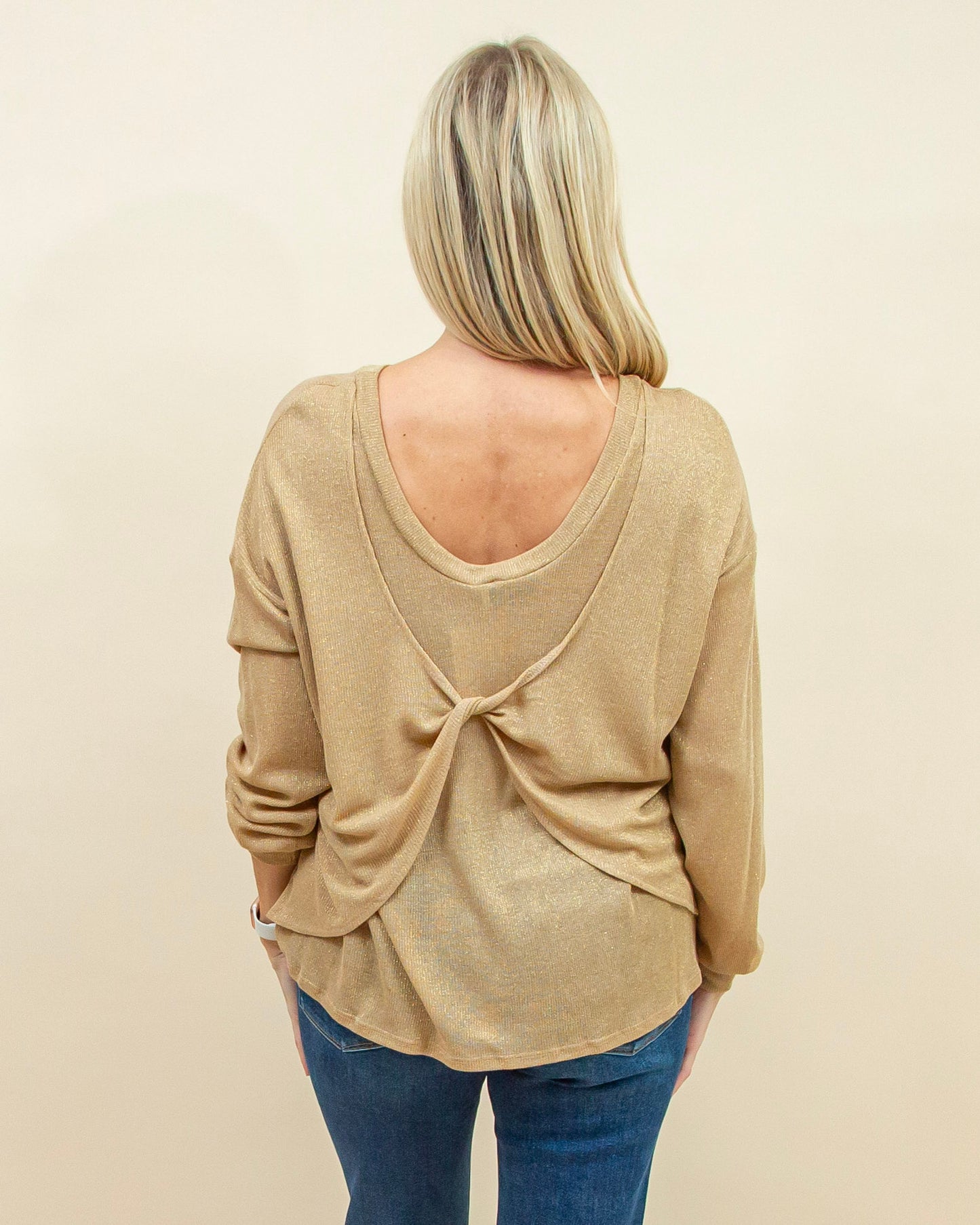 The Get The Scoop Top in Gold brings effortless shine to any outfit, combining a classic scoop neckline and relaxed fit with a softly shimmering knit that catches the light in a subtle, elevated way. The twist-back detail adds an unexpected, feminine finish, making this top just as perfect for a dressed-up night out as it is with denim for a polished everyday look.