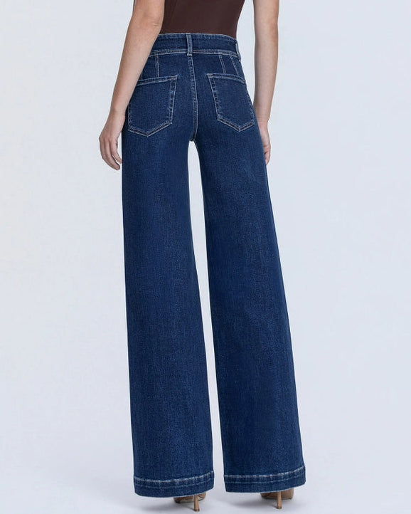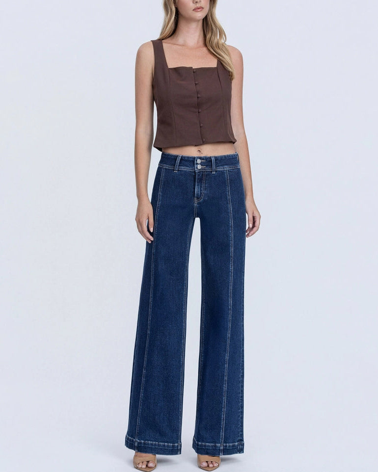 High rise front seam detailed dark wide leg jeans Comfort stretch denim, high rise waist, front seam detail, full length, dark wash, wide leg jeans
