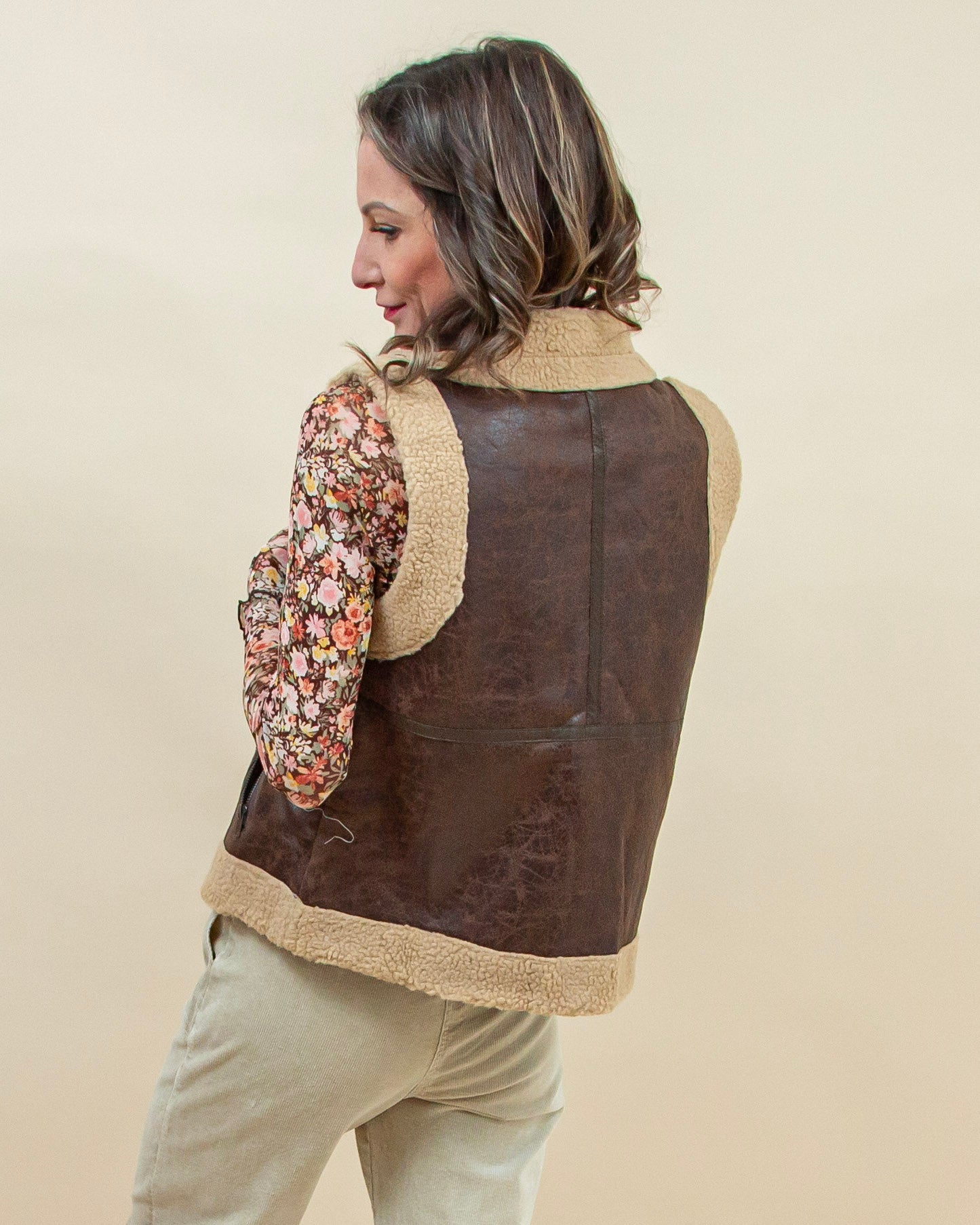 The Rustic Retreat Moto Vest in Brown brings just the right balance of edge and coziness to your layered looks. Designed with a dark brown faux leather exterior and lined in soft cream sherpa, this faux shearling moto vest feels as good as it looks. An asymmetrical zip front and classic notched lapels give it that timeless moto feel, while zippered side pockets add a functional, polished touch. Perfect for layering over lightweight knits or fitted tops, this vest adds warmth, texture, and effortless style to fall and winter outfits alike.