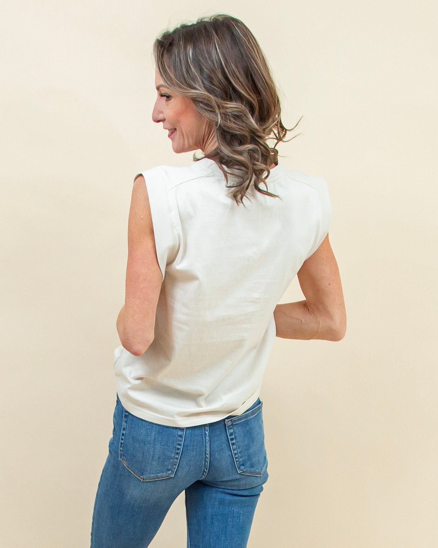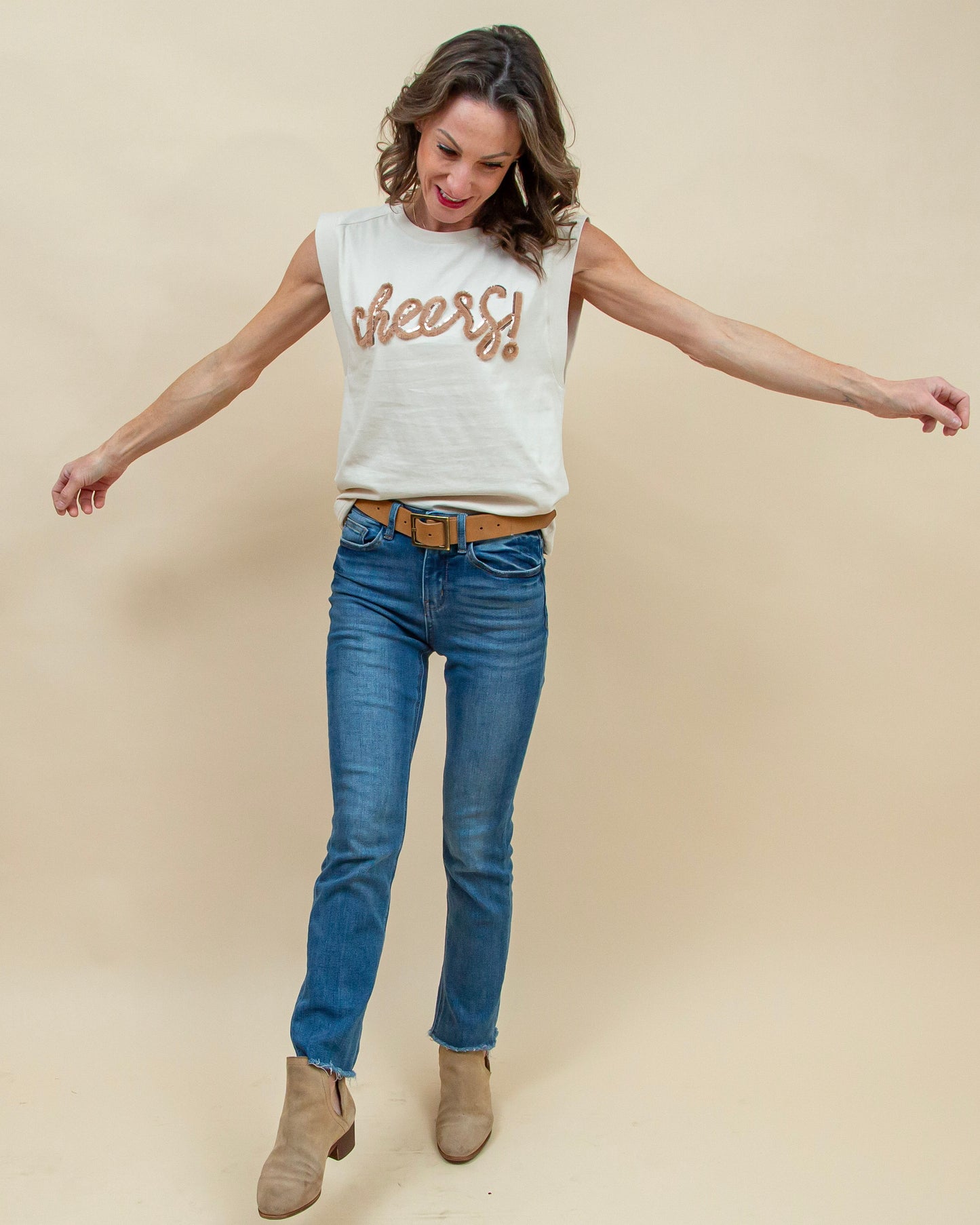 The Cheers to You Top in Cream/Champagne brings a playful pop of personality to your everyday lineup. Made from soft, lightweight cotton, this sleeveless muscle tee keeps things comfortable while still feeling styled. Bold sequin embroidery spells out “Cheers!” in a warm champagne tone, adding just the right amount of sparkle. Designed with structured shoulders, a classic crew neckline, and a relaxed, boxy fit, it’s easy to dress up with denim and heels or keep casual with your favorite everyday layers for a fun, feel-good look.