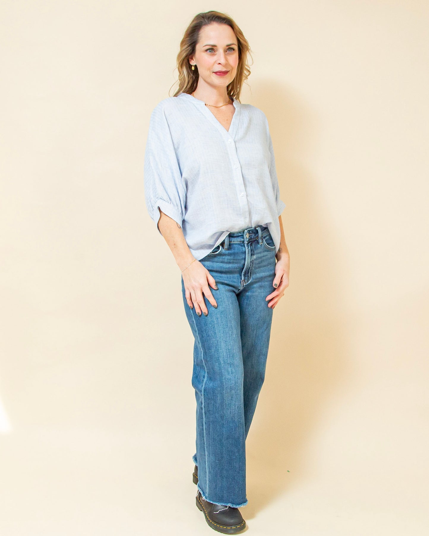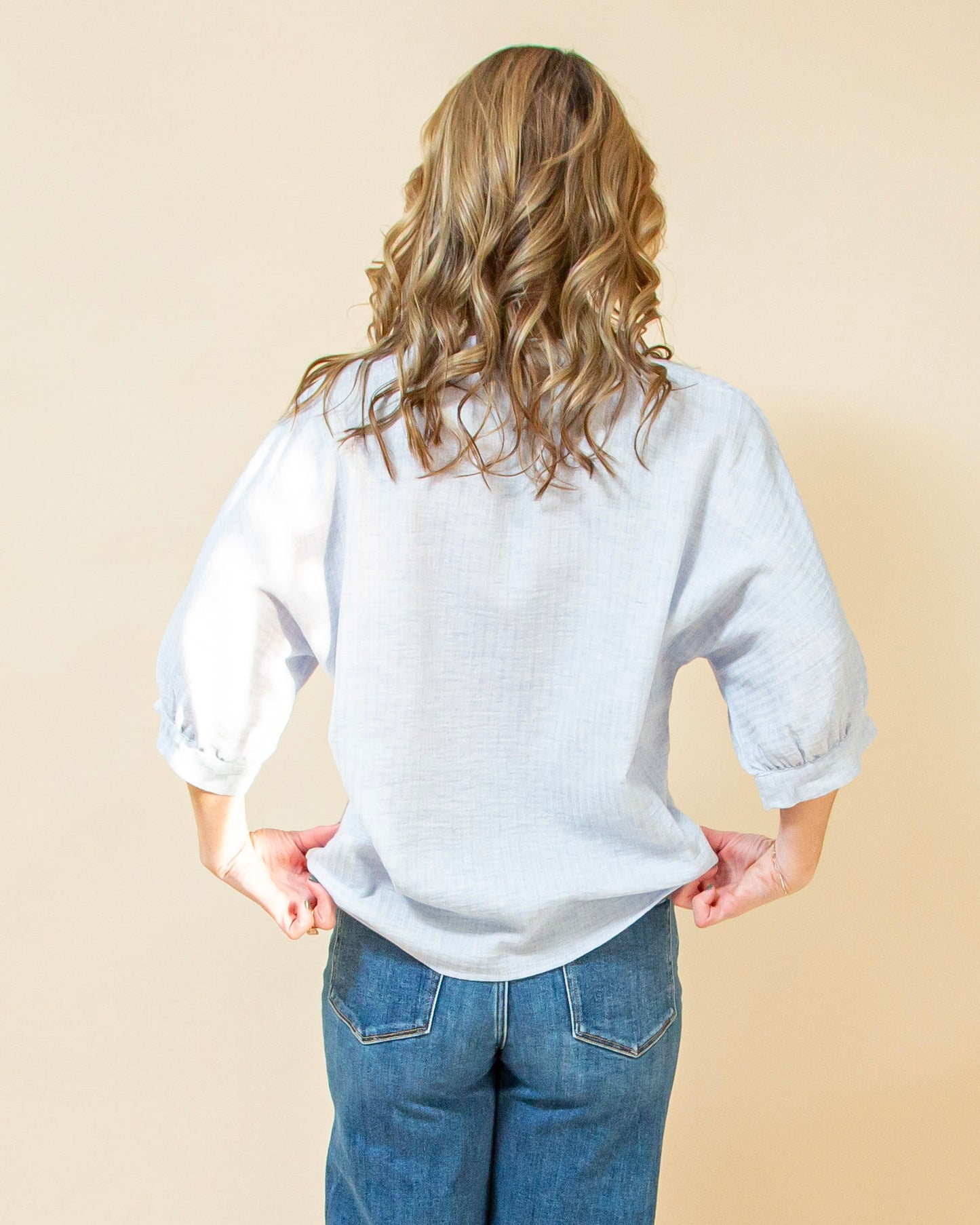 China collar y neck, elbow dolman sleeve, pinstriped, linen like shirt