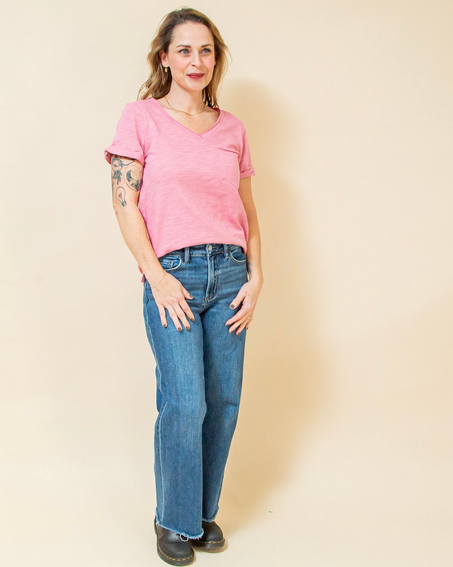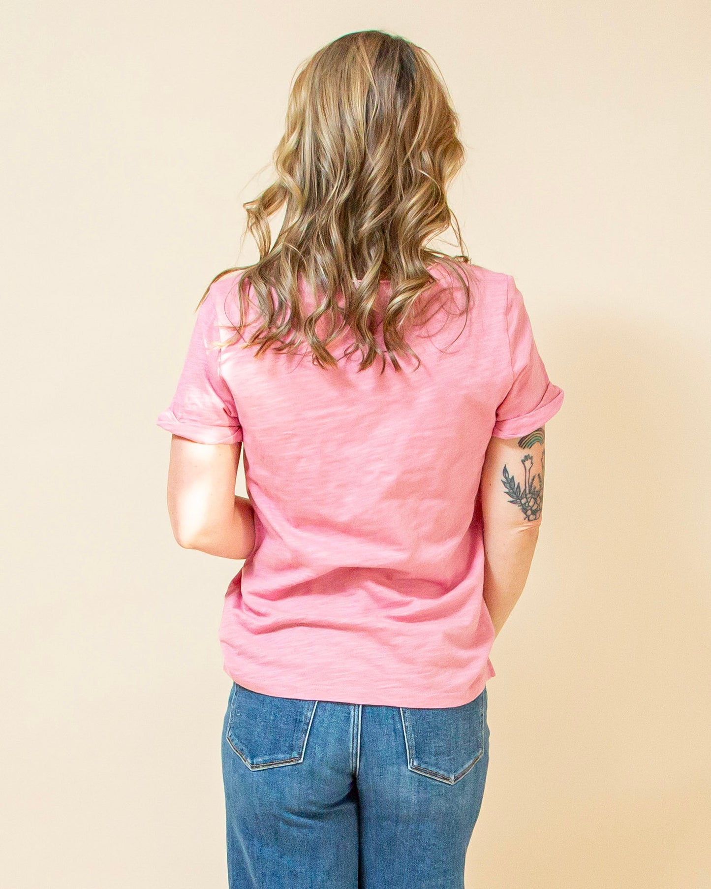 The Lived-In Love Tee in Pink Blush is that perfectly worn-in top you’ll reach for again and again. Made from soft cotton slub fabric, it has that easy, breathable feel that only gets better with time. The raw-edged V-neck and sleeves give it a relaxed, slightly undone look, while the twisted hem adds just enough shape to keep it flattering without trying too hard. Easy to half-tuck or wear loose, this tee is effortless, casual, and made for real life—whether you’re layering it under a jacket or wearing it solo on a laid-back day.
