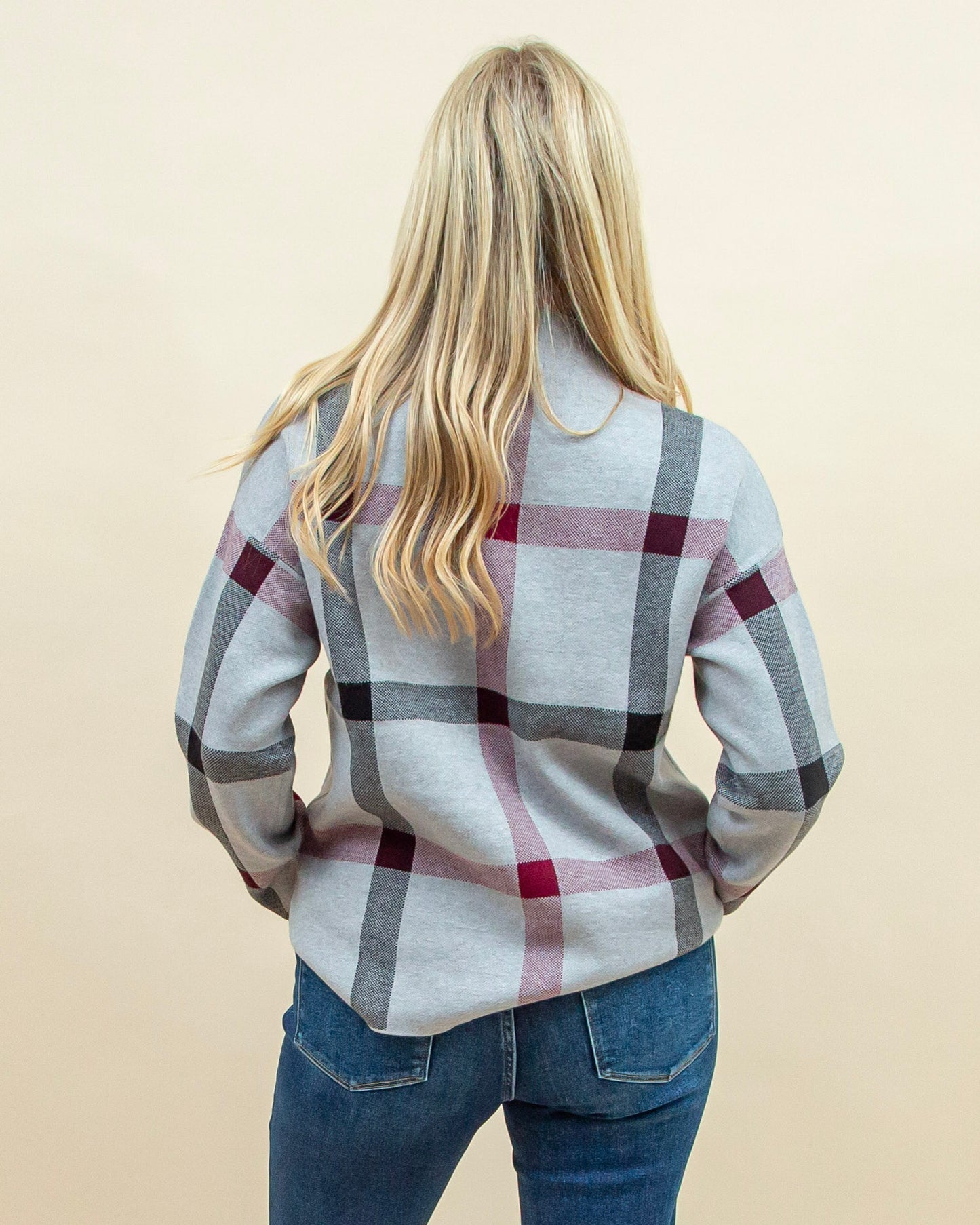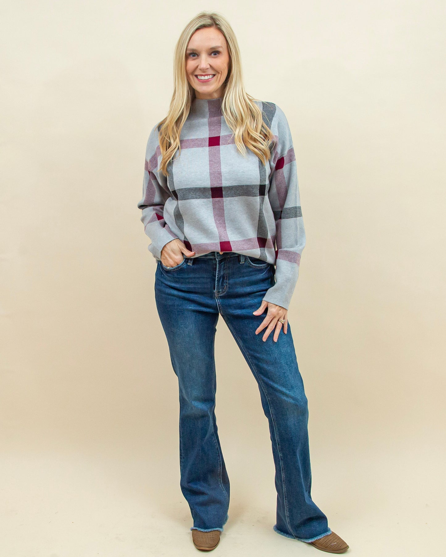 The Modern Merry Sweater in Heather Grey puts a fresh spin on a classic cold-weather layer. Crafted in a heavier knit with a subtle check jacquard pattern, this pullover features a clean mock neckline and long sleeves for a polished, cozy feel. Easy to style and warm without being bulky, it’s a go-to sweater for crisp days and effortless seasonal outfits.