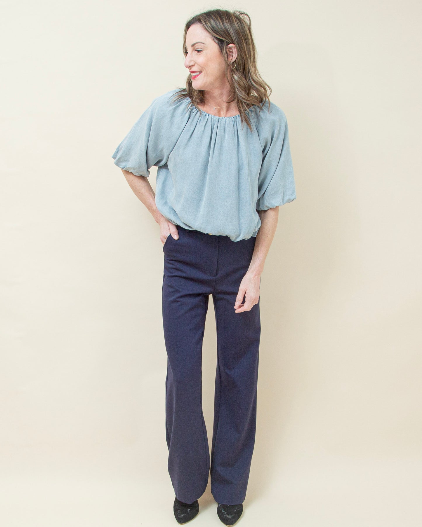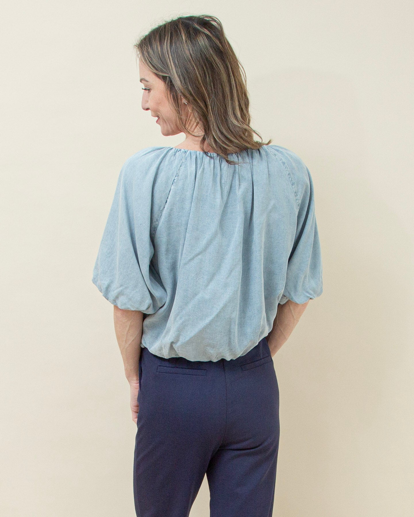 Light, effortless, and endlessly wearable, the Do It All Top in Denim Blue features a soft, flowy silhouette with a gently gathered neckline that adds subtle dimension. Designed with short sleeves and an easy drape, this top transitions seamlessly from workdays to weekends, pairing perfectly with tailored trousers or your favorite denim for a polished yet relaxed look.
