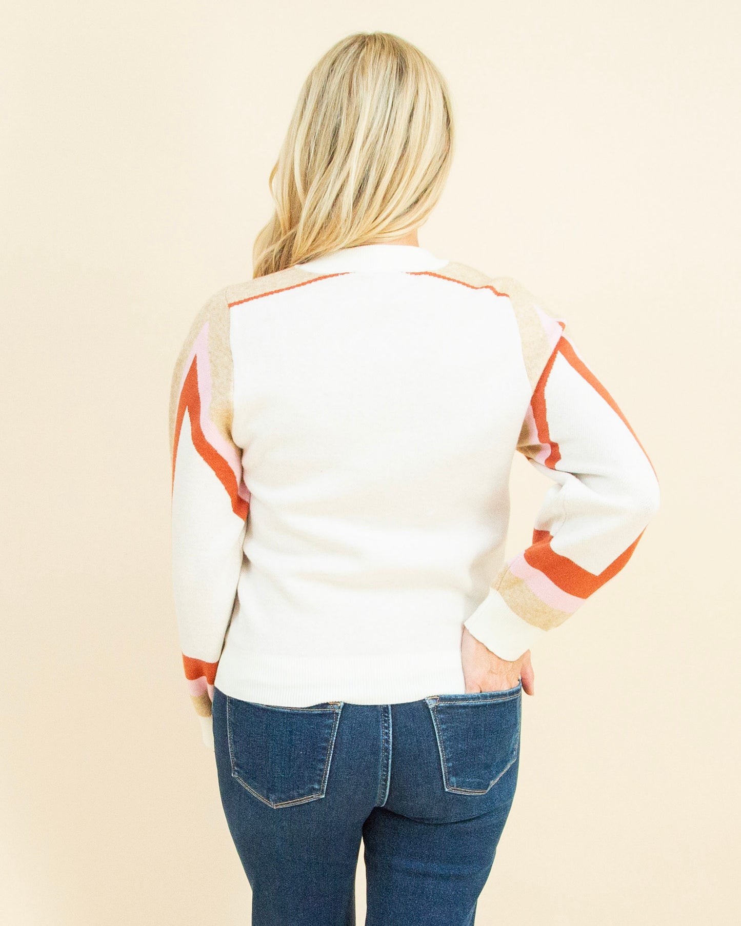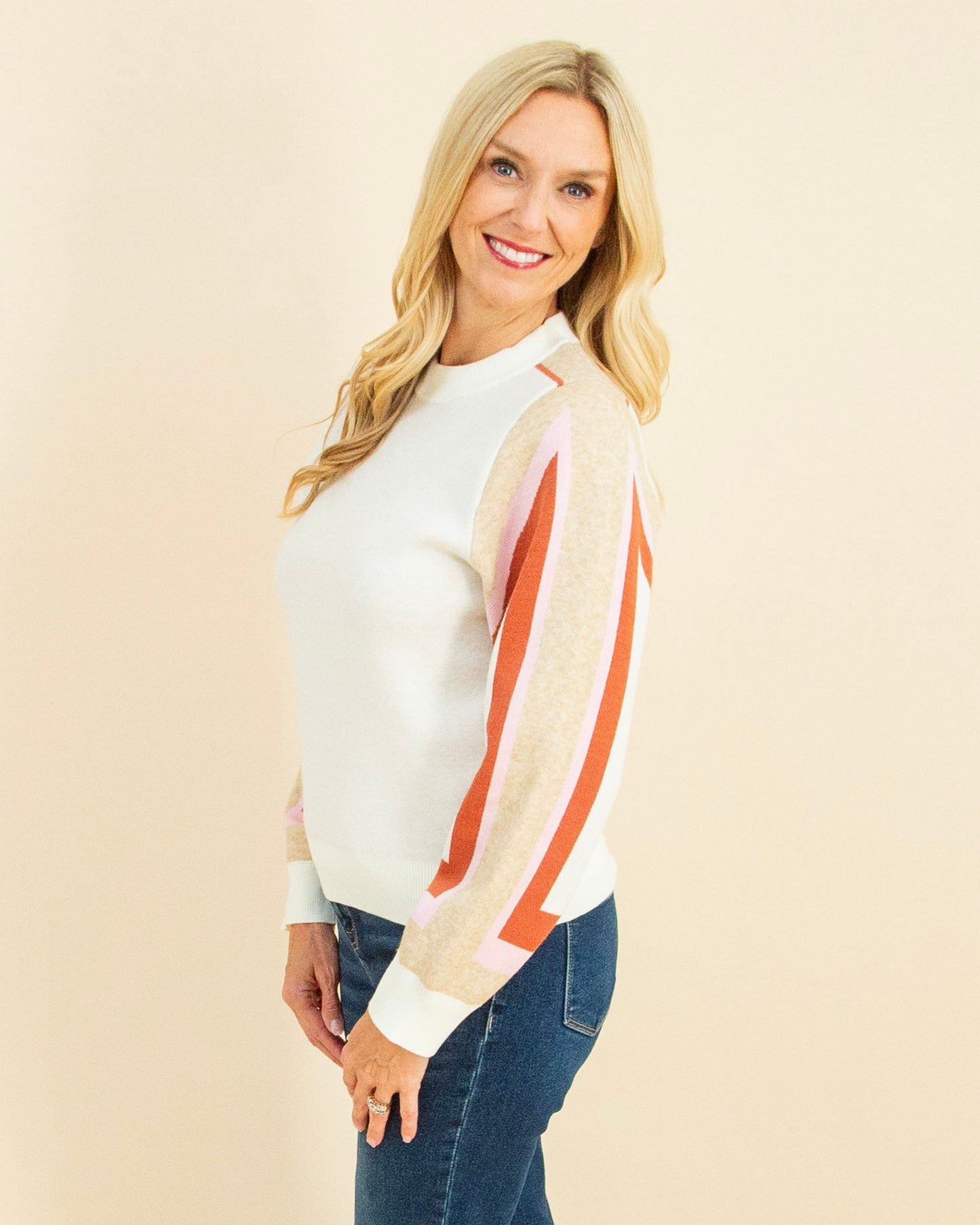 The Chic Contrast Sweater in Cream brings an effortless touch of color to your fall lineup. This cozy pullover pairs a classic cream body with warm, colorblocked sleeves in tan, light pink, and burnt orange for a look that’s equal parts soft and striking. Finished with ribbed cuffs and a ribbed neckline, it’s the kind of sweater that looks perfectly put-together no matter how you style it—jeans, skirts, or tailored trousers all welcome.