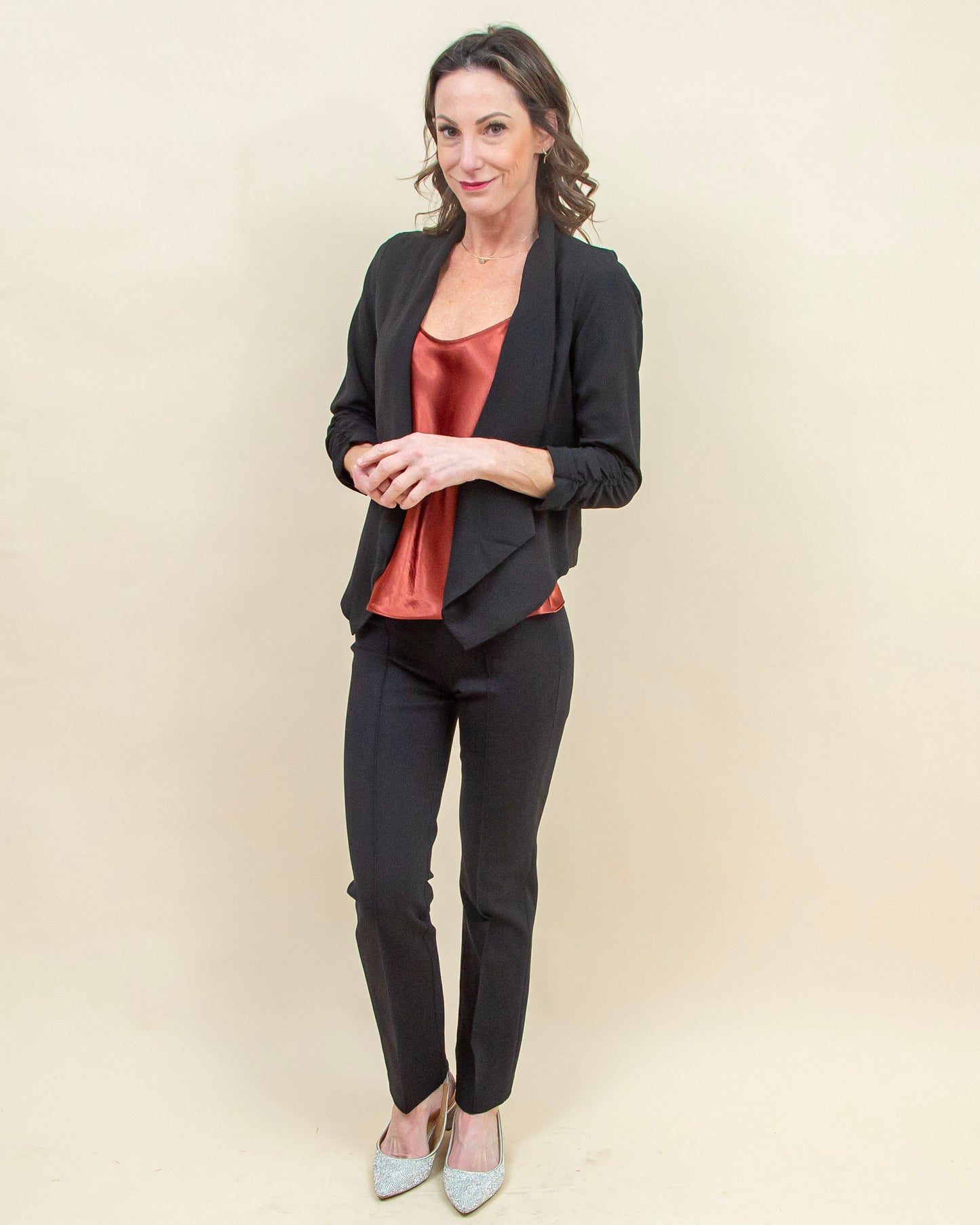 The Ready For Anything Blazer in Black is your ultimate go-to layer for polished, effortless style. Designed with a draped open-front collar, this blazer adds soft structure while keeping the look relaxed and wearable. The 3/4 length ruched sleeves create an intentionally styled finish that works just as well for the office as it does for nights out. Easy to throw on over camis, tees, or dresses, this versatile blazer elevates any outfit without feeling stiff—making it a true wardrobe staple you’ll reach for again and again.