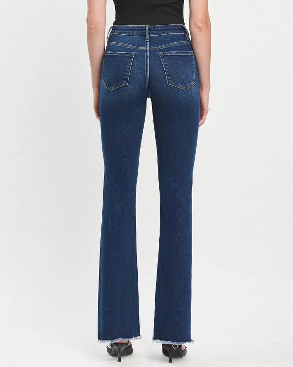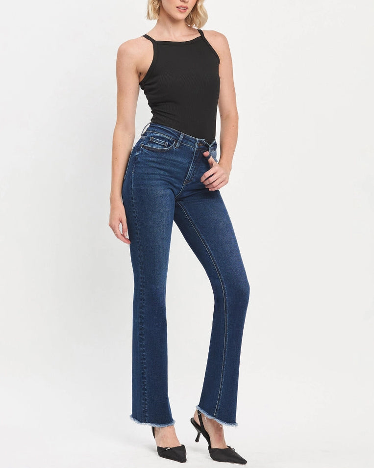High rise raw hem bootcut jeans Comfort stretch denim, high rise waist, raw hem, full length, bootcut jeans