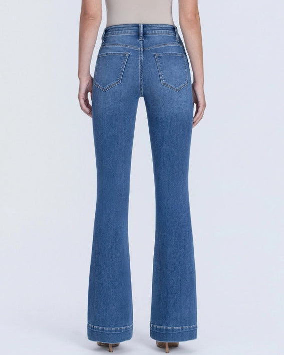 Super high rise trouser hem flare jeans Comfort stretch denim, super high rise waist, 5 pockets, trouser hem, full length, medium wash, flare jeans