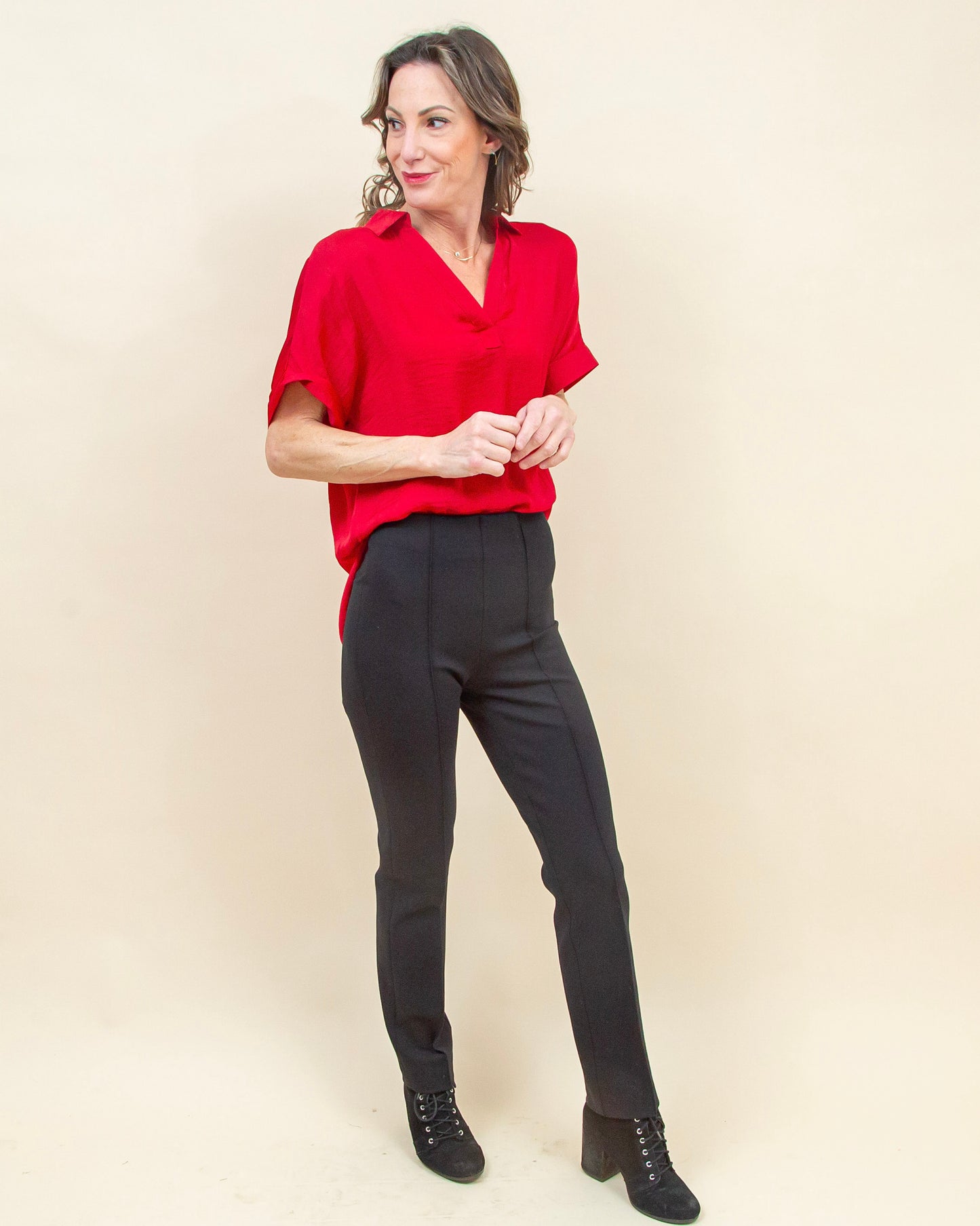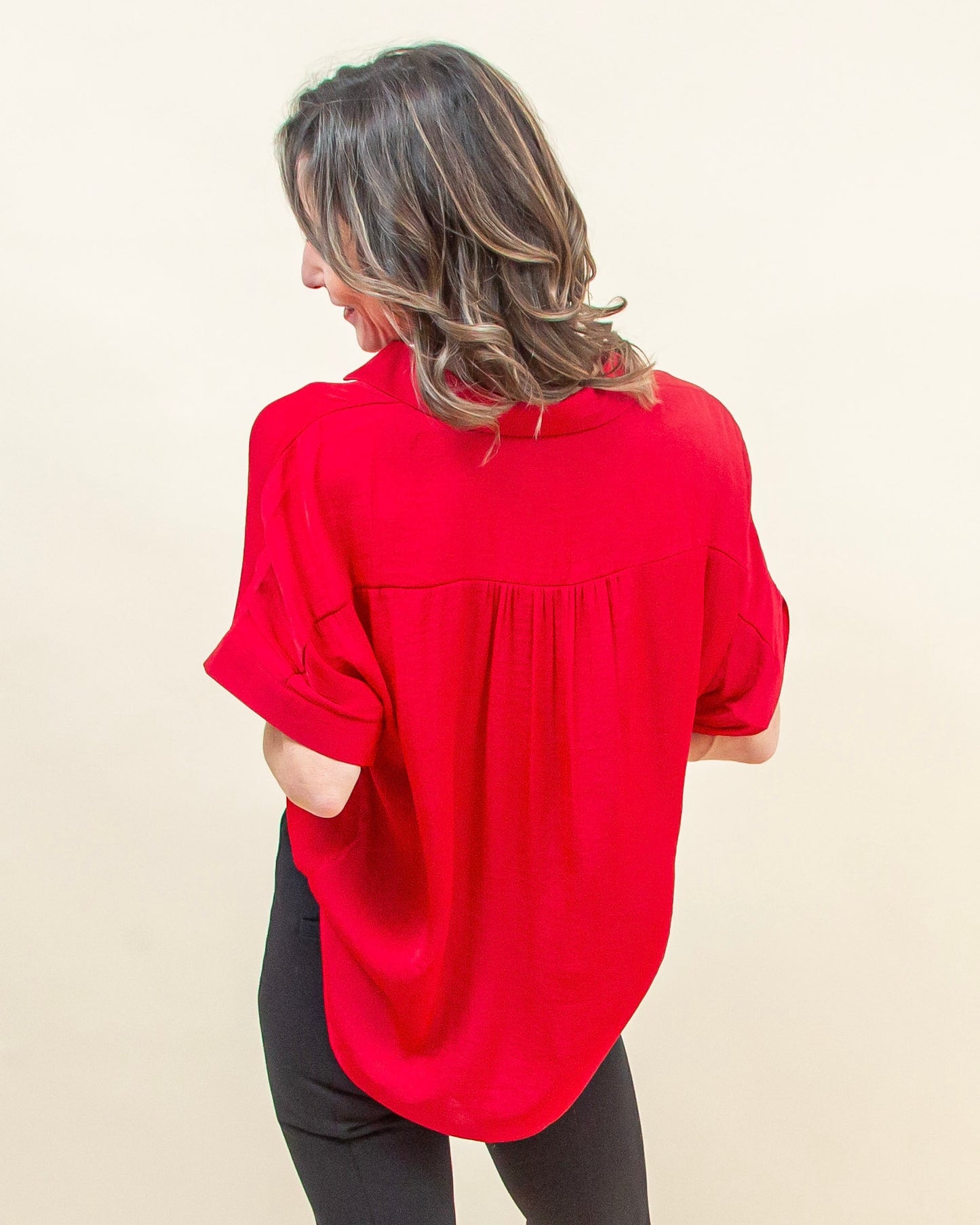 The High Regard Blouse in Crimson Red is an easy, feel-good piece that makes getting dressed simple. The soft satin fabric drapes nicely without clinging, and the high-low collar gives it just enough detail to feel special while still being very wearable. The relaxed fit through the body keeps it comfortable and flattering, whether you’re tucking it in slightly or wearing it loose. Pair it with black pants or denim for a polished look that doesn’t feel fussy and works for everything from everyday plans to casual holiday gatherings.