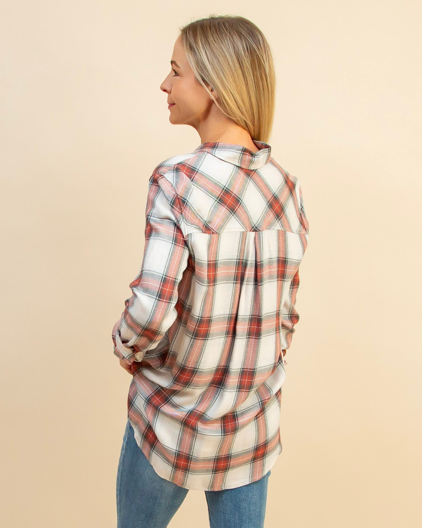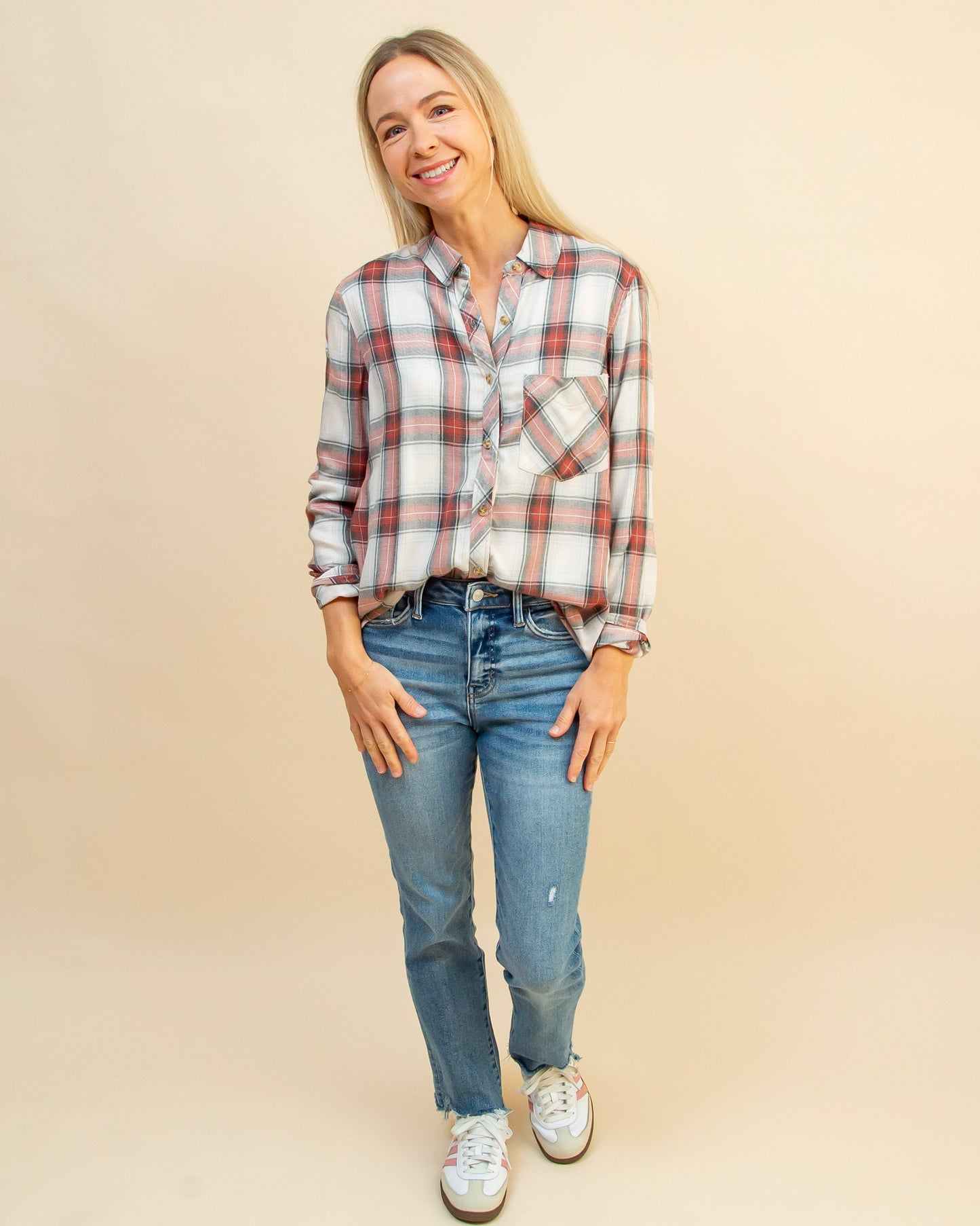 The Fall Feelings Flannel in Heather Grey brings all the cozy vibes with none of the fuss. This ultra-soft plaid button-up features an easy, relaxed fit with drop shoulders and a below-the-hip length that’s perfect for layering. Red, grey, and white tones give it that classic fall look, while the chest pocket, side slits, and rounded hem keep it comfortable and effortless. Toss it on with denim, leggings, or over a basic tee—this is the flannel you’ll grab anytime you want to feel warm, relaxed, and instantly put together.
