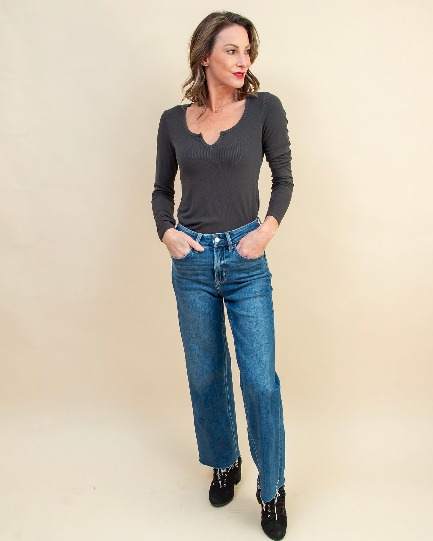 The Simply Stated Top in Dark Charcoal is that effortless essential you’ll wear on repeat. Soft, stretchy ribbed fabric gives it a comfortable, flattering fit, while the notched neckline adds just a touch of interest to an otherwise classic long sleeve. It’s easy to layer, easy to style, and made for everyday outfits—whether you’re pairing it with denim, slipping it under a jacket, or keeping things simple and chic on its own. A true wardrobe staple with a laid-back feel.