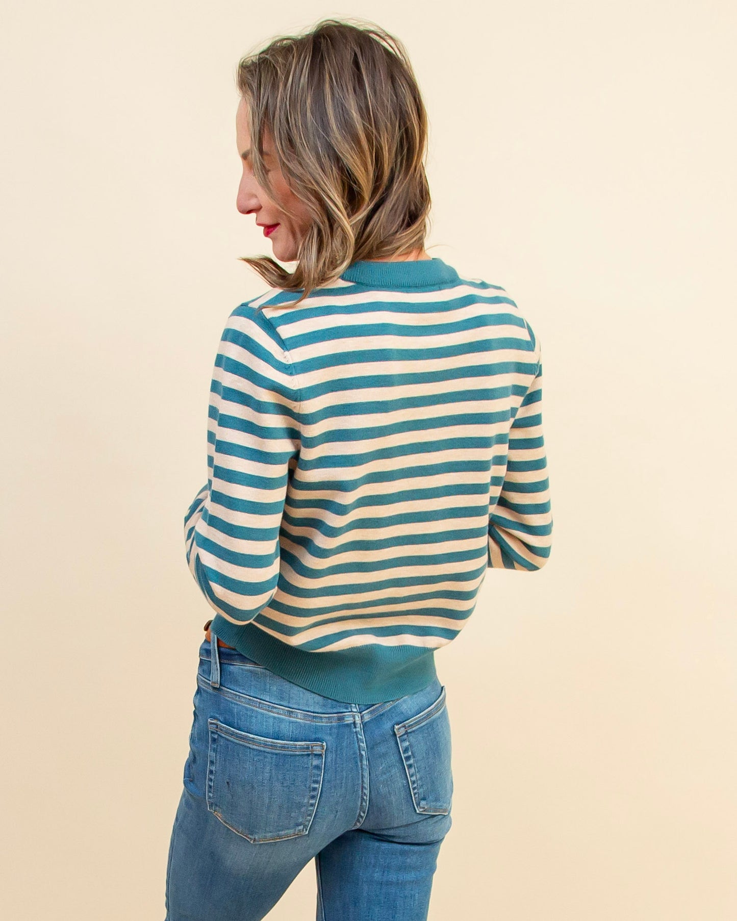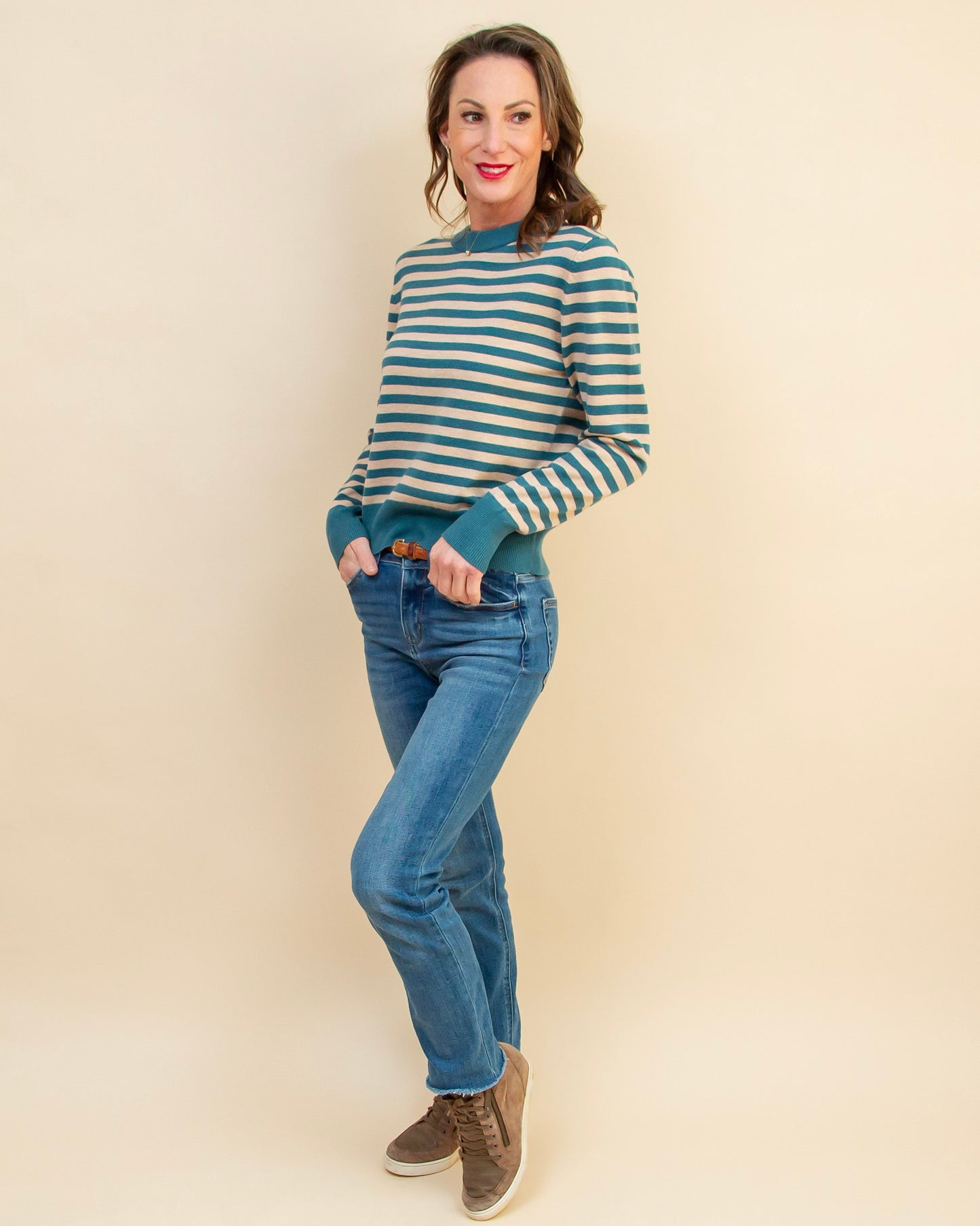The Sweetly Striped Sweater in Teal delivers that preppy-cute look with zero effort required. This classic cropped pullover features soft horizontal teal and oatmeal stripes, finished with ribbed detailing at the neckline, cuffs, and hem for a polished touch. Lightweight and easy to wear, it pairs perfectly with high-rise denim for an everyday look that’s timeless yet fresh. Cozy, simple, and endlessly versatile—this is the stripe sweater you’ll keep coming back to all season long.