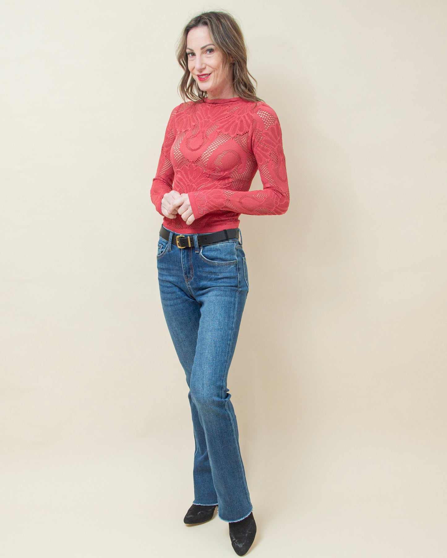 Meet the Subtle Statement Mesh Top in Crimson, a bold yet refined layering piece with effortless appeal. Designed with a seamless knit jacquard and delicate fishnet overlay, this top adds rich texture and visual interest to any look. The stretchy nylon and spandex blend offers a comfortable, flexible fit, while the mock neckline and long sleeves keep the silhouette polished. Wear it on its own for a standout moment or layer it under jackets and knits for added depth and dimension.