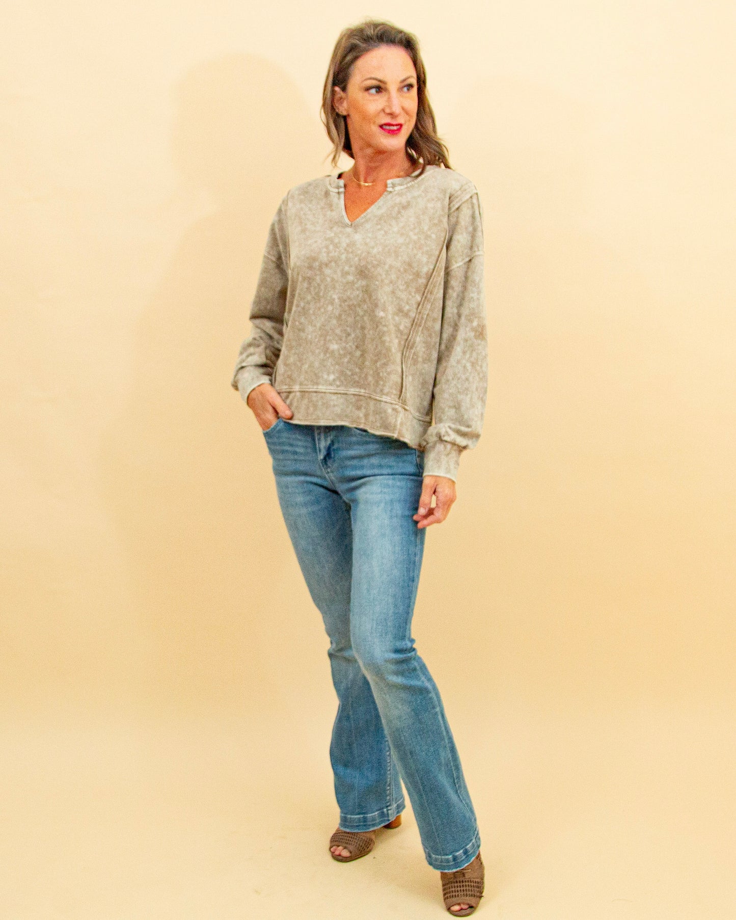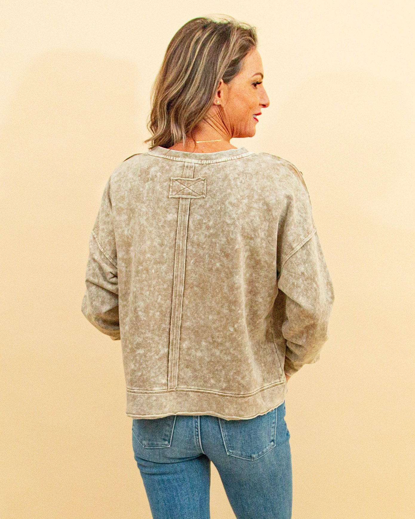 The Patch Me In Top in Tan is an oversized long-sleeve knit designed for laid-back, effortless style. Featuring a split V-neck, exposed seams, and patchwork details, its acid-washed finish gives it a lived-in, vintage-inspired look. Crafted from a soft cotton-poly blend, this relaxed pullover is perfect for layering or wearing on its own for an easy, casual vibe.