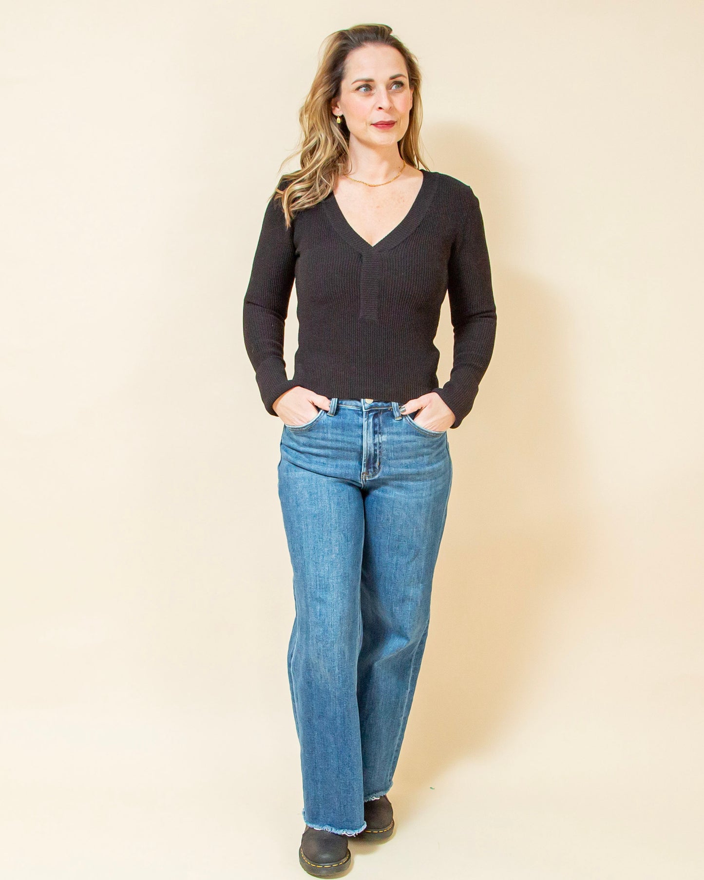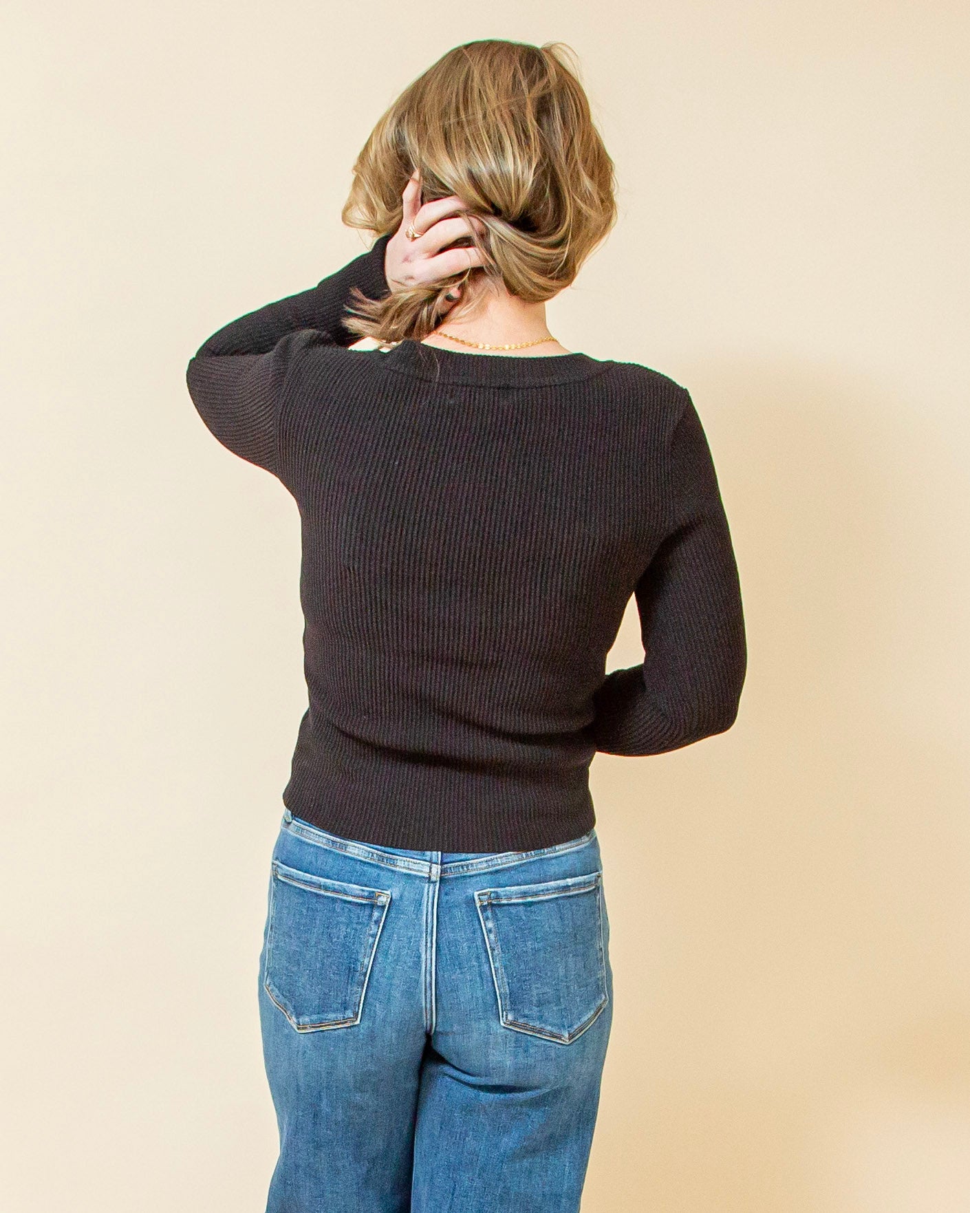 The Let’s Go Out Top in Black is made for those nights when you want to feel confident, comfortable, and effortlessly put together. Crafted from a premium ribbed knit with just the right amount of stretch, this shaper-fit top is designed to contour and flatter your shape. The deep V neckline with a placket adds a sleek, elevated edge, while long sleeves with wide cuffs balance the fitted silhouette. Polished enough for a night out and easy enough to style again and again, this is a go-to piece that knows exactly where you’re headed.