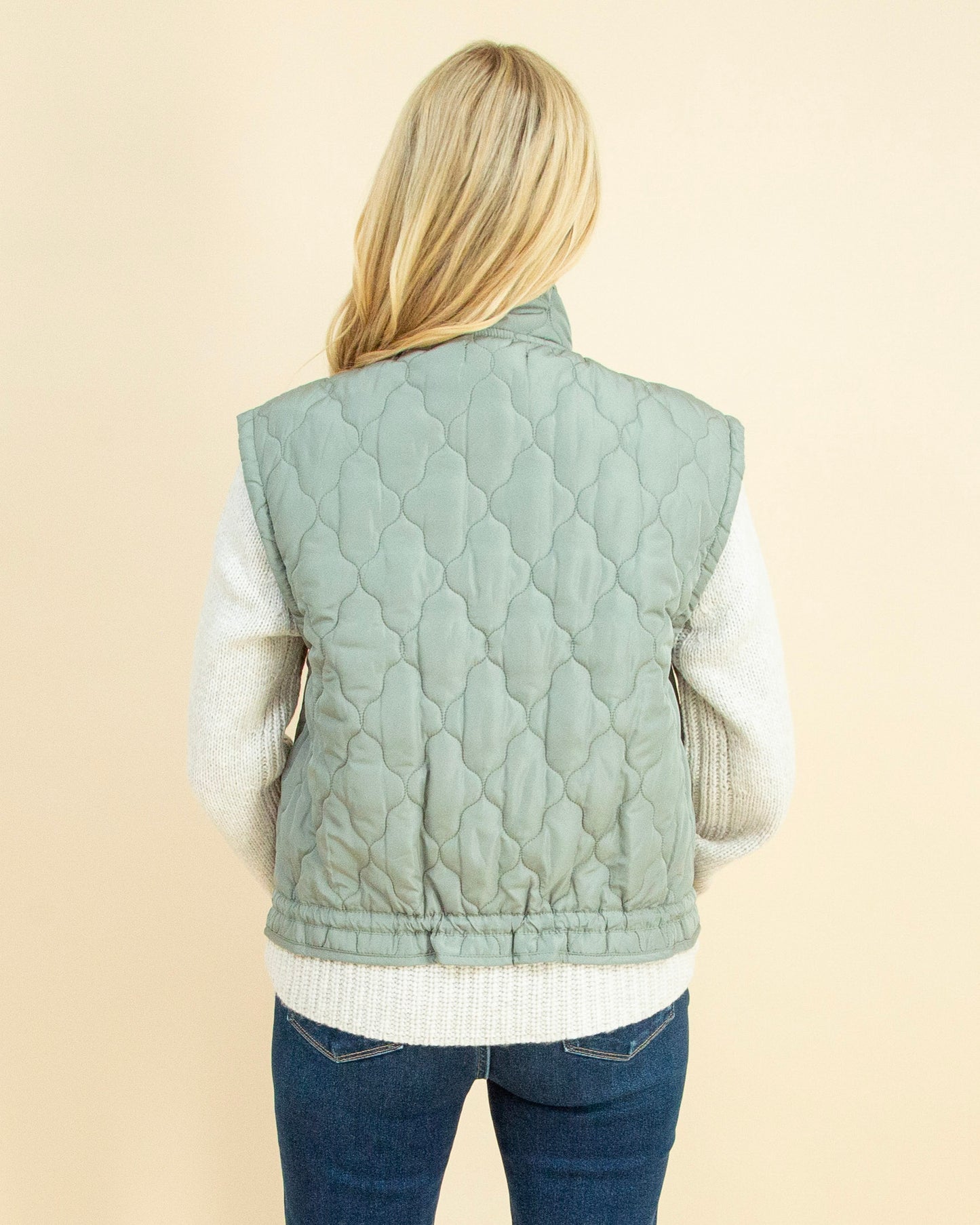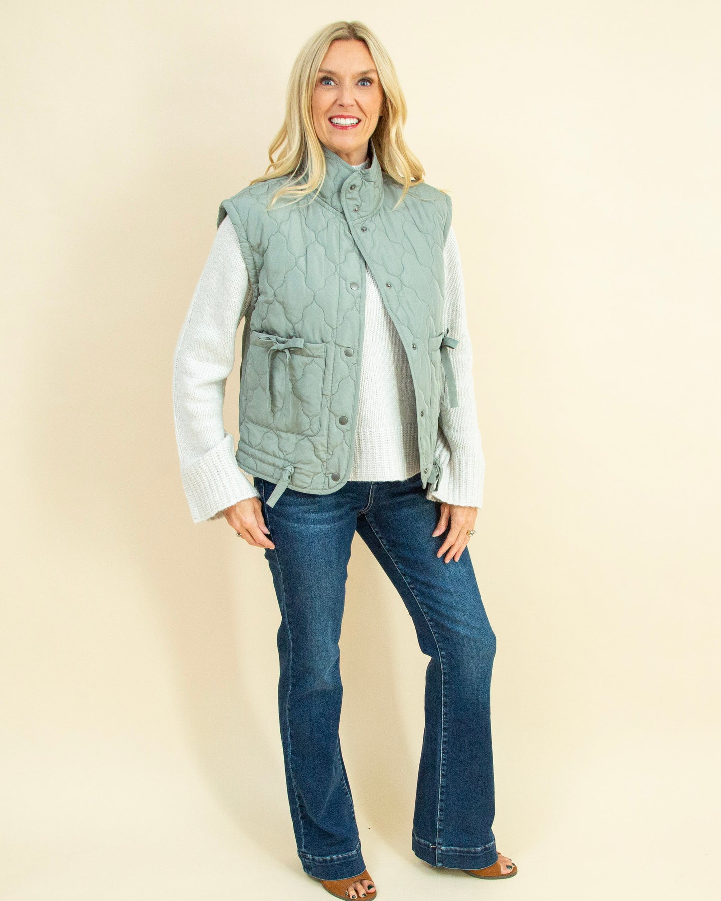 Stay warm without sacrificing style in the Tied & True Puffer Vest in Dusty Sage. This quilted puffer vest features a high neckline for extra coziness, snap button front closure, and chic tie details that add a feminine twist to the classic silhouette. Front pockets keep your hands toasty while giving you that laid-back, effortlessly put-together look. The perfect layering piece for crisp fall mornings and cool winter days alike.