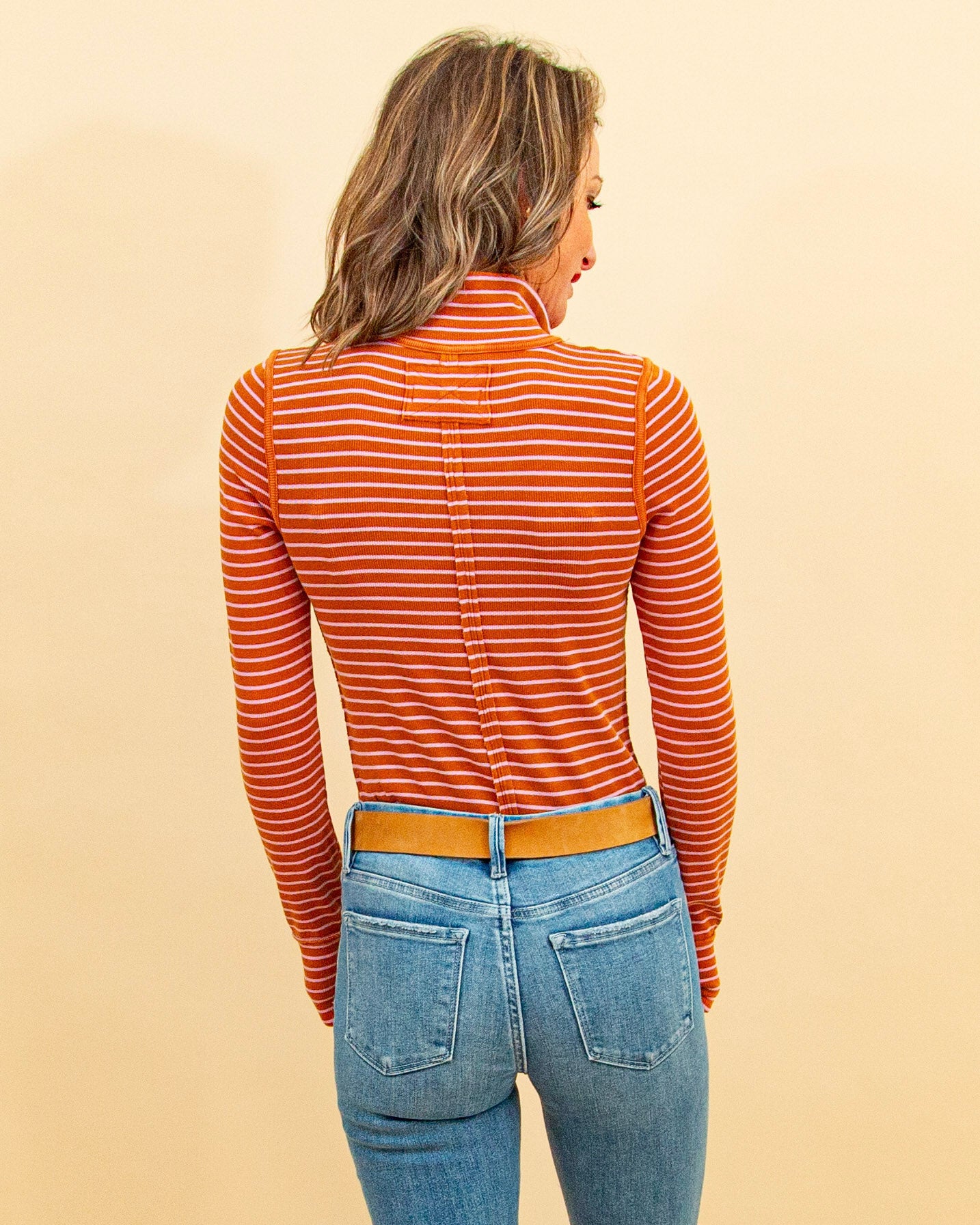 The Lake Henley Stripe Top from Free People’s We The Free collection is a sleek twist on a classic. Made in a stretchy ribbed cotton blend, it features a fitted silhouette, mock neckline, and henley detail. Finished in cinnamon and pink stripes with a bold orange trim, it’s a fresh essential for every day.