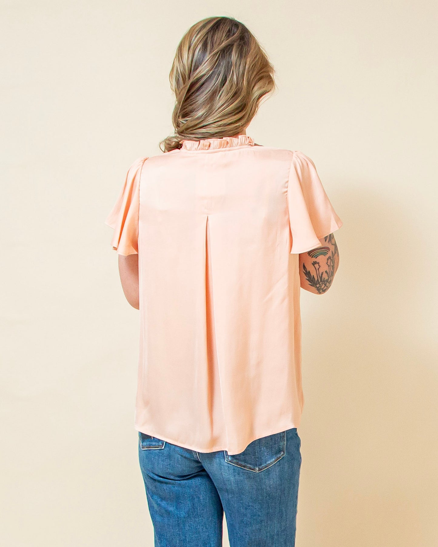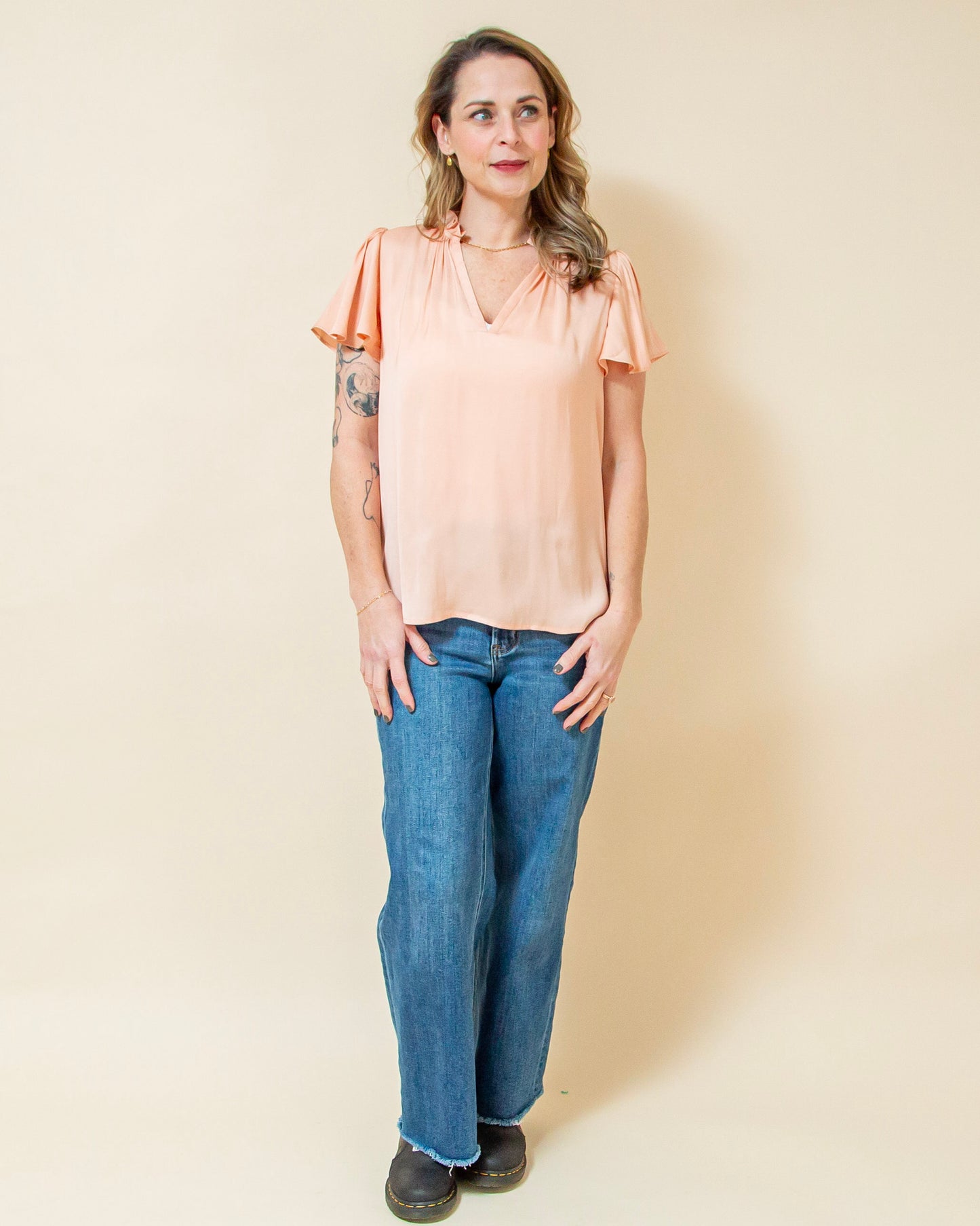 The Sweet Treat Top in Apricot is soft, feminine, and effortlessly polished. Designed with a delicate ruffle neckline and airy flare sleeves, this top drapes beautifully for a relaxed yet refined look. The lightweight fabric moves with you, making it perfect for warm days or easy layering under a jacket. The apricot hue adds a fresh, flattering pop of color that feels both cheerful and elevated. Easy to dress up or down, this is the kind of top that instantly makes an outfit feel a little more special—no extra effort required.