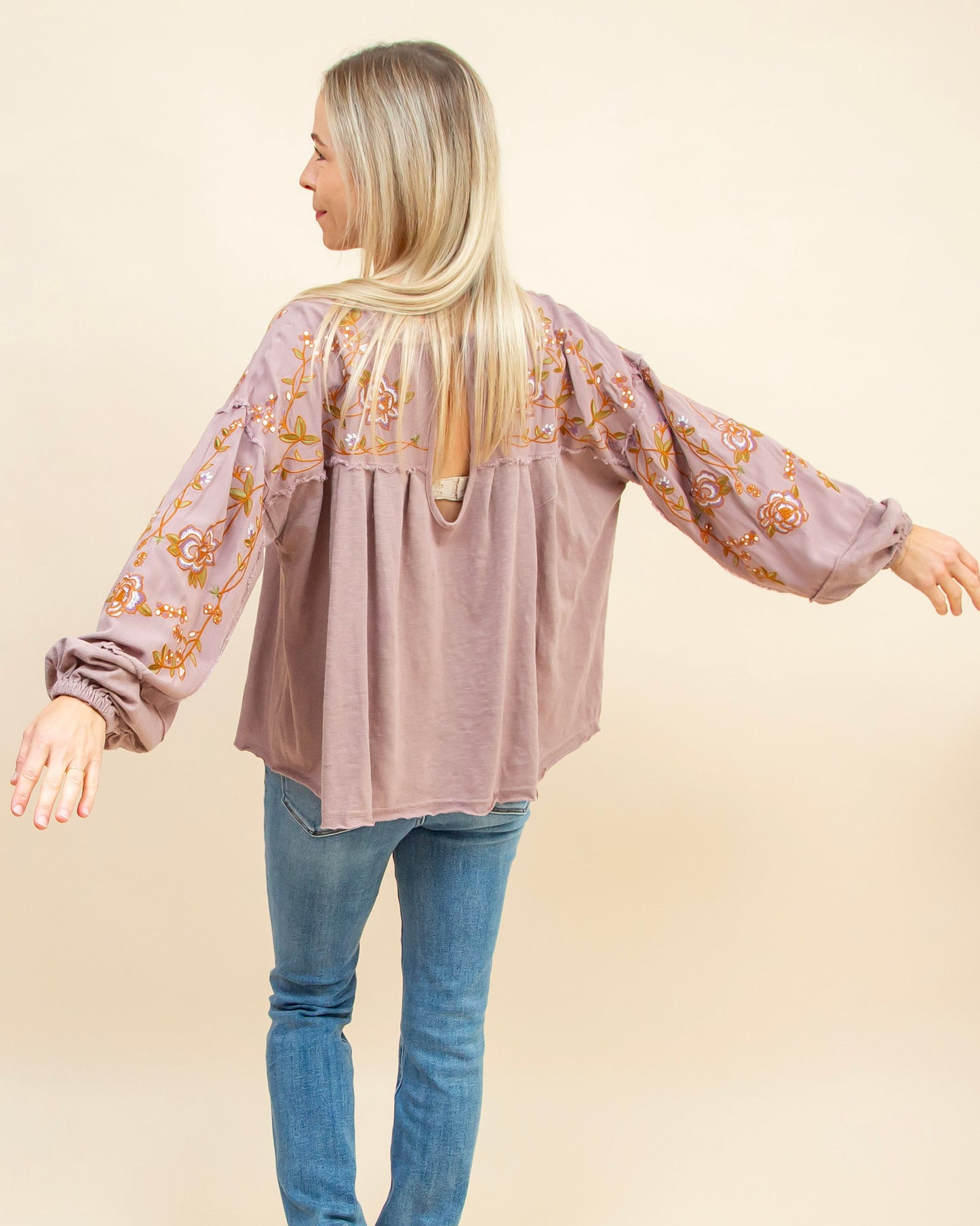 The Oh My Darling Blouse in Rose Taupe is a romantic statement with an effortless touch. This embroidered beauty features delicate brown rose embroidery along the yoke and sleeves for a warm, vintage-inspired feel. The relaxed drop sleeves cinch softly at the wrists, creating a graceful silhouette, while the subtle back cutout adds a modern, feminine twist. Flowing and flattering, this blouse pairs perfectly with denim or tailored pants for a look that’s equal parts charming and chic.
