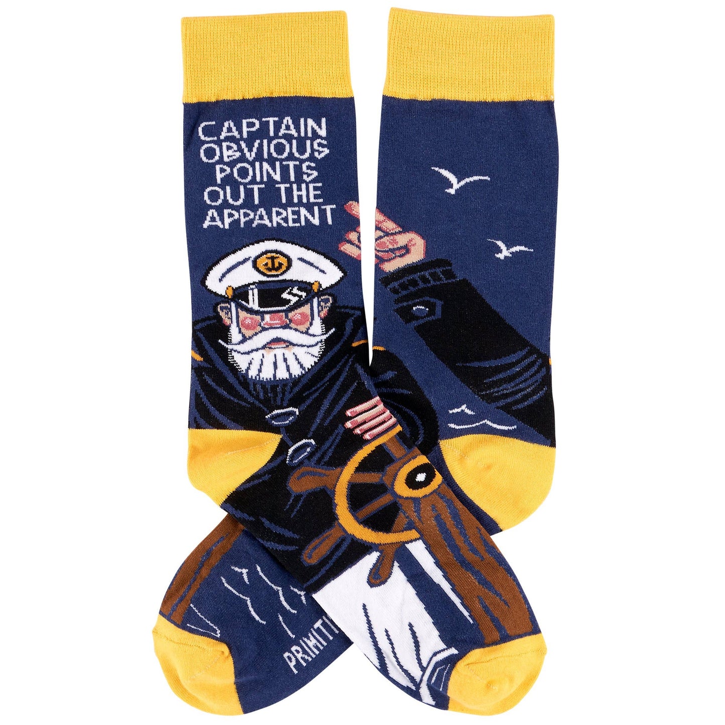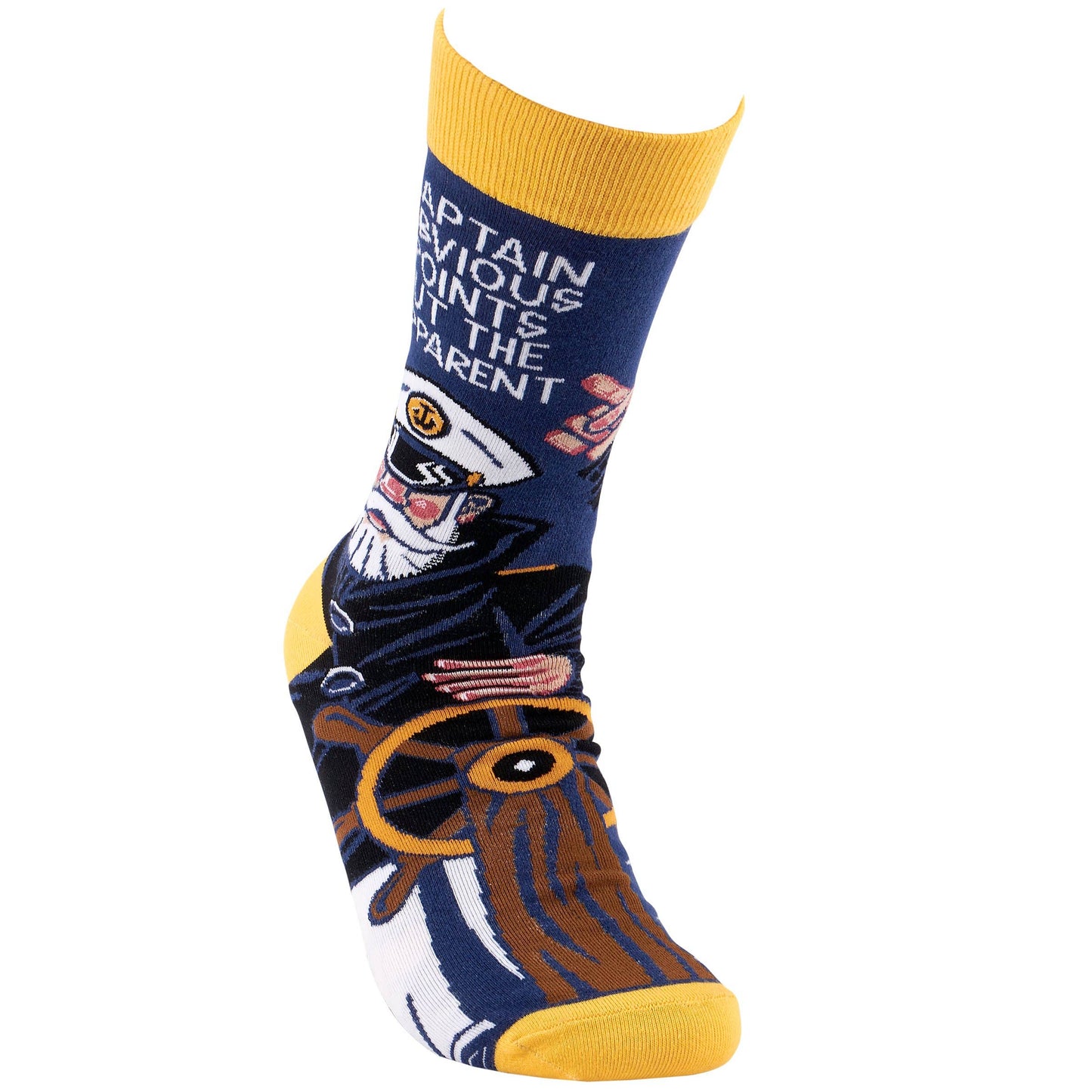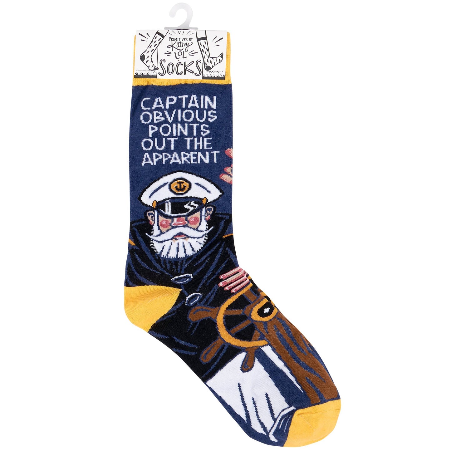 A pair of colorful socks from our LOL-Made You Smile Collection displaying a playful hand illustrated design of a sea captain steering and pointing with a humorous sentiment that reads "Captain Obvious Points Out The Apparent." These giftable socks are made with a cotton, nylon, and spandex blend for a one size fits most design. Our Captain Obvious socks come with a decorative header card and a clear plastic hanger for easy rack display and gifting. A funny gift perfect for everyday self-expression.